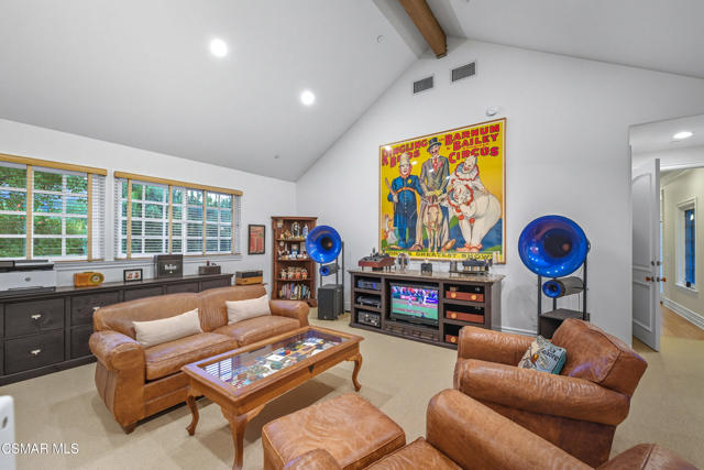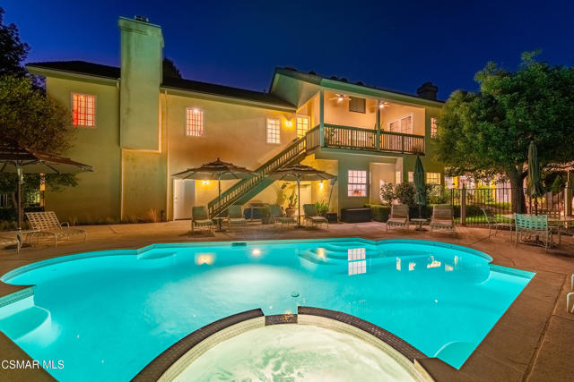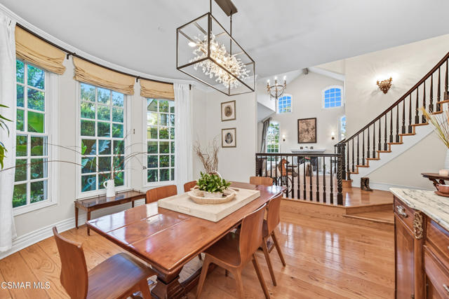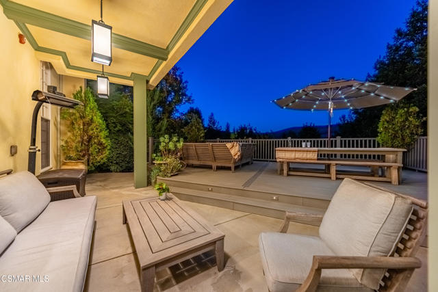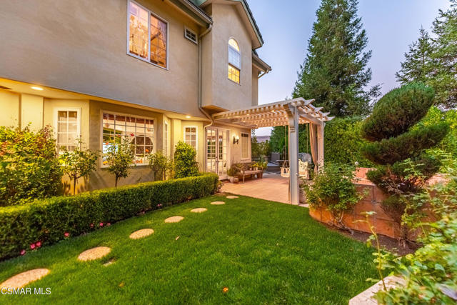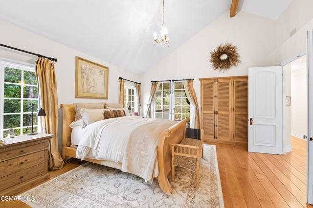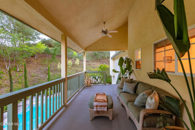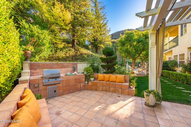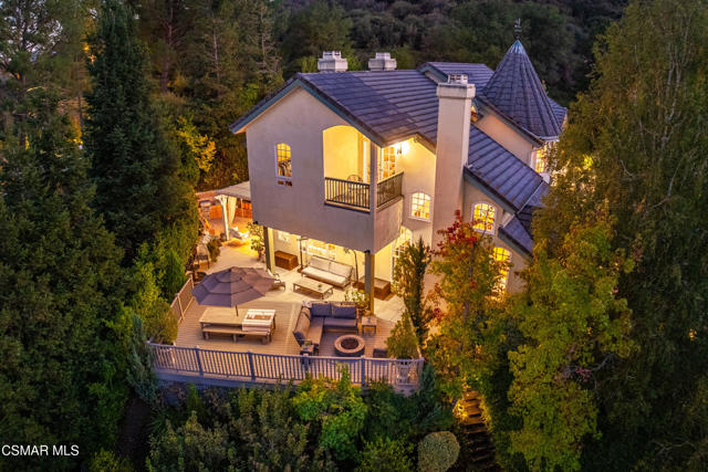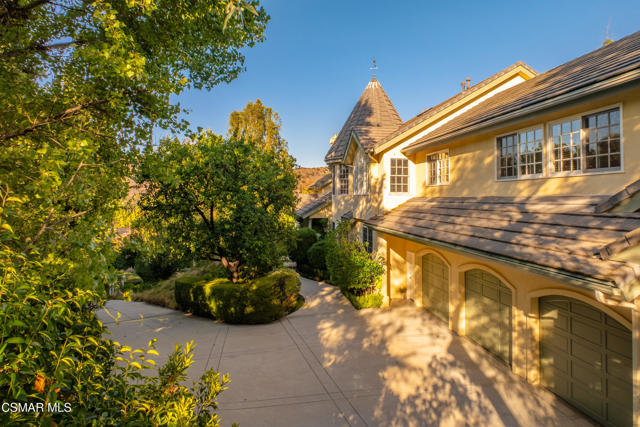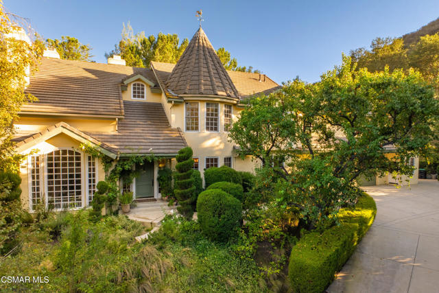 Elegant Country French Estate in Prestigious Medea Valley nestled atop a privately gated knoll. Masterfully built with the finest materials including designer tiles from famous Mission Tile Co. Sweeping mountain and valley views are the backdrop to classic elegance with modern amenities. The community security gate ensures exceptional privacy and a peaceful retreat. Upon entry, you're greeted by soaring ceilings and expansive windows in the Formal Living Room, while the spacious Dining Room features a graceful bay window ideal for entertaining. The heart of the home is the open-concept Family Room, Kitchen, and Breakfast Nook. The gourmet Kitchen includes a prep island, Viking appliances, walk-in pantry, white cabinetry, and generous counter space. The sunlit Family Room offers a built-in entertainment center, fireplace, and French doors leading to a charming patio with built-in BBQ. A downstairs Bedroom with custom office cabinetry provides a flexible workspace and a private bath. Upstairs, the luxurious Main Suite features a fireplace, sitting room with private veranda, dreamy walk-in closet, and a spa-like bath with soaking tub. French doors open to a large balcony that overlooks the pool and serene mountain vistas. Completing the upstairs are 3 additional bedrooms and two well-appointed baths plus an amazing 500 sq ft Bonus Room with fireplace and private exterior entry. The beautifully landscaped grounds include a private orchard with apple, peach, plum, and lemon trees, a pool and spa, expansive deck with beautiful views and a park-like playground. Recent upgrades include a new HVAC system and remodeled pool with new equipment.Additional highlights: Oversized three-car garage with custom cabinetry, 108 sq ft potting room/studio or storage, EV-ready with separate meter and hookup.Private community access to hiking trails in the Santa Monica Mountains Preserve and Paramount Ranch. Medea Valley Estates is just five minutes from the 101 freeway and offers convenient access to schools, fine dining, wineries, shopping, and Malibu beaches. A rare blend of privacy, luxury, and location--this custom-built estate is truly one of a kind.