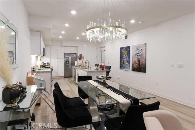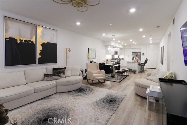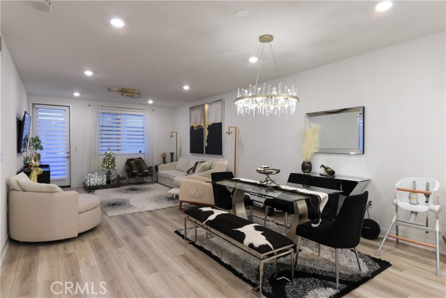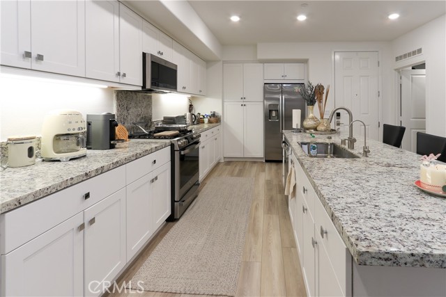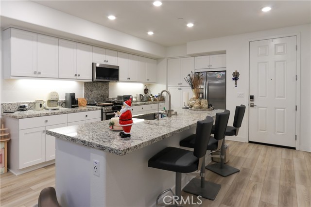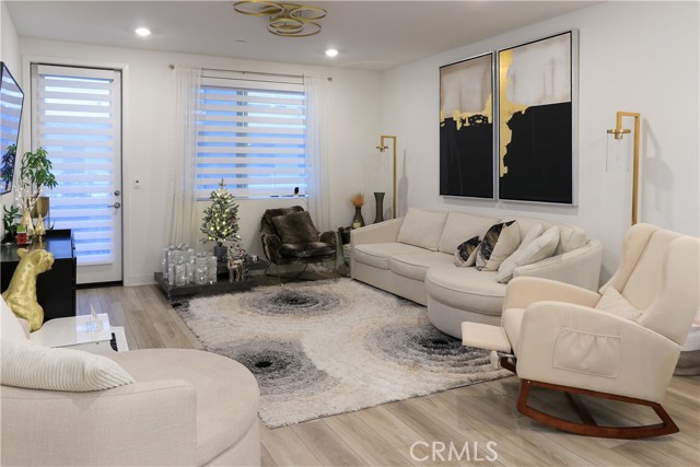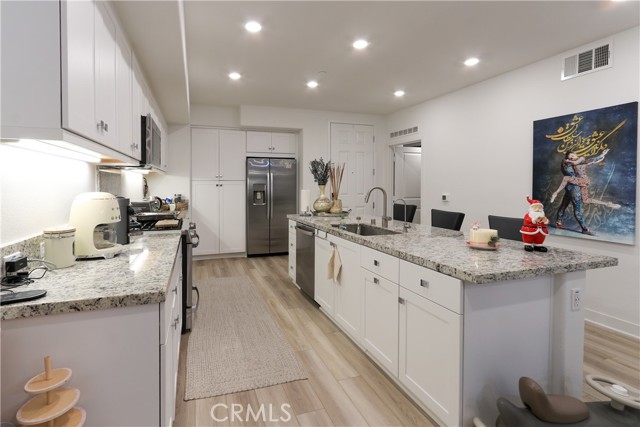 Welcome to this stunning condo, in the heart of Anaheim's Platinum Triangle. This luxurious two bedroom, two bath home features a spacious and modern single level floor plan. The gourmet kitchen includes granite countertops, stainless steel appliances, and huge island ideal for entertaining. The large living room opens to the balcony perfect for indoor and outdoor living. The primary suite is a true sanctuary with spacious ensuite bath, dual sink vanity and enclosed spa-like shower. The secondary bedroom features a generous closet space. Highlights include: tandem garage with extra storage and EV charger, laundry room, laminated flooring, recessed lighting, water filter, digital door lock, window blinds, central trash chute. The community is like exclusive resort style living, including BBQ areas, pools , jacuzzi, dog parks, locker room for package deliveries. Minutes from Disneyland, Downtown Disney, Angel's Stadium, shops, restaurants and Easy access to the 5, 57 and 22 freeways. Don't wait to see this turn-key home!