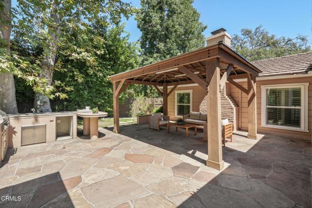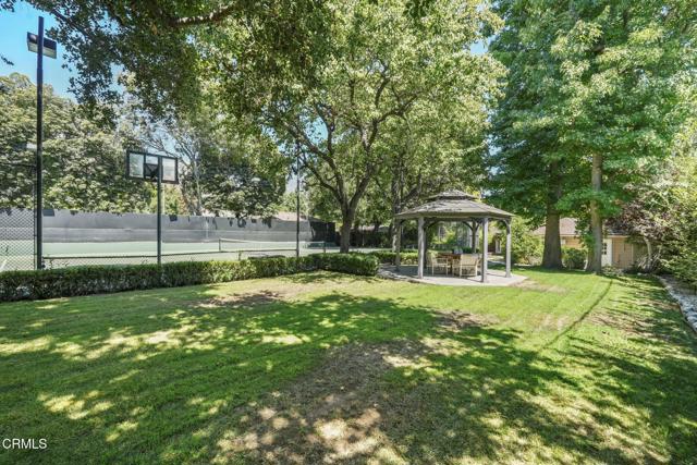Exclusive, picturesque, and peaceful. Life in Arcadia's prestigious Upper Rancho enclave is all of these things and more. Tucked behind lush privacy hedges, 1405 Rancho Road presents the perfect opportunity to join the city's most highly sought community. Resting on a flat 30,000+ sqft lot, this beautifully maintained single-level home features resort-style grounds with a guest house, outdoor kitchen, and full tennis court. Exceptionally private and surrounded by natural beauty, you've found a magical place to plant roots and savor quality time with those you treasure most. A manicured front yard with a sweeping horseshoe driveway makes a grand first impression. As you enter the home, gleaming hardwood floors, handsome woodwork, and spacious interiors create a warm and welcoming atmosphere. The formal living room to your right is generously sized and filled with natural light making it the perfect place for piano lessons on a baby grand. On the opposite side of the foyer, the formal dining room invites large scale holiday feasts. Just beyond, the chef's kitchen offers plenty of room for multiple sets of hands to help cook special meals and comfort food alike, while a cozy breakfast nook allows for slow weekend mornings spent lingering over coffee as the rest of the house wakes. The family room, with coffered ceiling and fireplace, invites game nights and movie marathons. Open both pairs of French doors to the backyard and let a soft breeze drift in, one more reason to stay close. The generous primary suite includes French doors that open to serene views and a private patio, as well as a walk-in closet and decadent spa bath. Three additional bedrooms each offer a spacious and cheerful place for rest. In the rear, a fully gated yard offers a park-like sanctuary. Vast landscaped grounds with a gazebo, covered patio and built-in barbeque, plus a private tennis court, create an unbeatable way to host everything from birthday parties to charity events in grand fashion. A home to treasure for decades, 1405 Rancho Road is defined by its quiet beauty and lasting character.