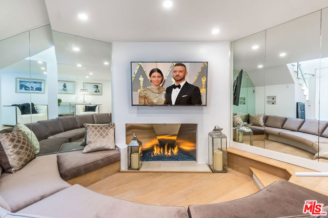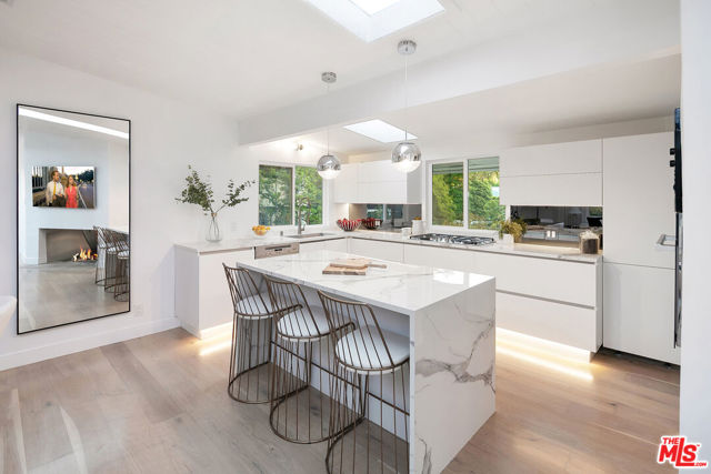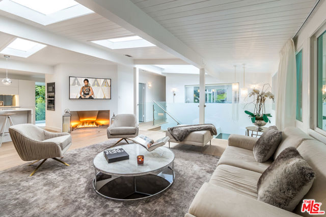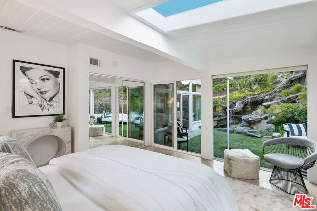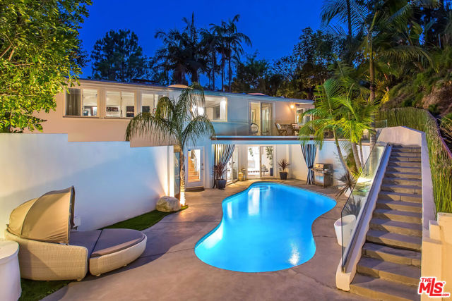 A very special "one of a kind" Mid-Century Oasis, and former home to several A-List celebrities. Nestled in a small cul de sac just 2.5 minutes behind The Beverly Hills Hotel, close to Sunset Blvd. This home has an wonderful "vibe", featuring an open floor-plan with excellent indoor/ outdoor flow. An abundance of natural light fills the home, including 9 sky-lights, and 3 oversized fireplaces. Large sumptuous Primary Suite w/ spa like bathroom, and 2nd bedroom both feature walls of glass which open out to a dramatic 50 ft. Waterfall, pond, lush yard & Fire Pit with hilltop yoga area. Updated newer Kitchen w/ porcelain counters, custom cabinetry, & top of the line MIELE appliances. Spacious, light-filled living & dining area set atop the trees. Downstairs features a private 3rd bedroom w/ separate gated entrance, perfect for guests, teenager, office or live-in. Media Den with Bar and fantastic sunken "conversation pit", around a fireplace, perfect for movie nights or gatherings. Heated pool with new equipment glows from every room at night. Private and Tranquil with only 2 homes on street and ample parking rarely found in the hills. Private, walled and gated entry, ready to move in! Recent 5 year rental average has been $20,150, so also an excellent income property with upside value. This contemporary gem is an incomparable property and rare offering.