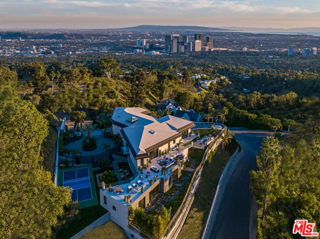 Experience ultimate luxury living in this exclusive Beverly Hills estate. This private, gated compound offers resort-style amenities on a sprawling lot. Upon arrival, you'll be greeted by a striking waterfall and lush landscaping, with ample parking for up to 10 cars. The estate features a hand-tiled Balinese pool, spa, and fire pit, complemented by stunning 180-degree city and ocean views. Enjoy outdoor dining with a full kitchen, expansive grassy yard, and sports/pickleball court. A wellness spa and gym with floor-to-ceiling glass doors open to breathtaking grounds. Inside the spacious main house, you'll find luxurious details including a great room with panoramic views, a gourmet kitchen with a 12-ft island, and a wood-paneled office with a bar. The home offers two primary suites, each with luxurious baths and terraces, plus three additional ensuite bedrooms and a vast outdoor deck. Additional features include a 2-bedroom, 2-bath guest apartment, a state-of-the-art theater, a tequila tasting room, a poker room, a 2000-bottle wine cellar, and a ~3000-sf finished garage with a glass elevator. With perfect finishes throughout, this estate is designed for those seeking an unparalleled rental experience in Beverly Hills.