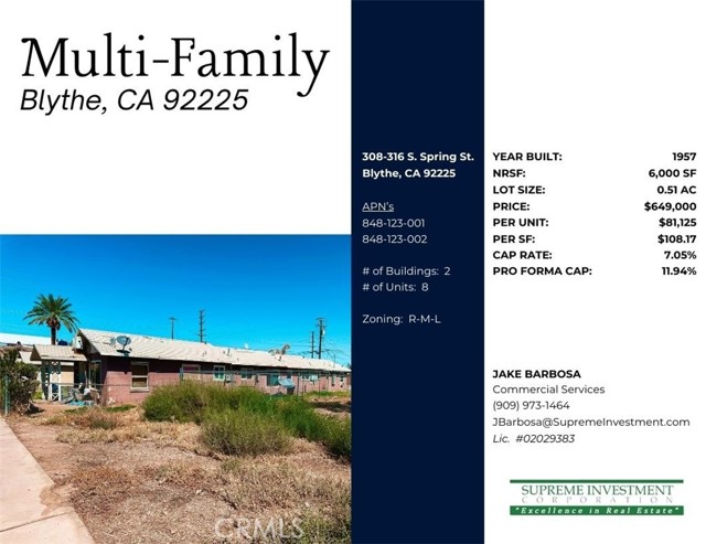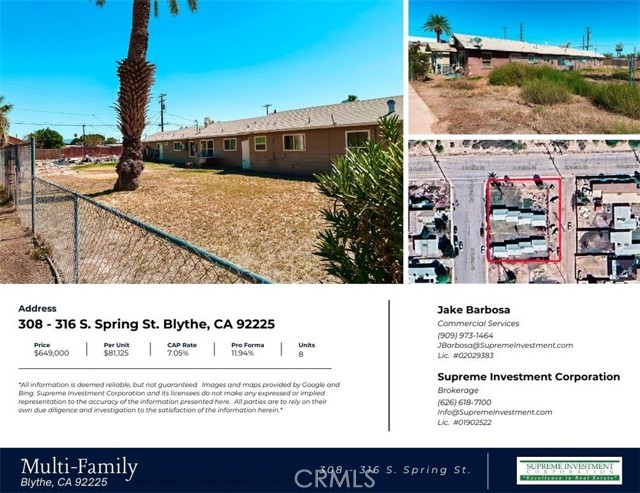 除了房屋基本信息以外,CCHP.COM還可以為您提供該房屋的學區資訊,周邊生活資訊,歷史成交記錄,以及計算貸款每月還款額等功能。 建議您在CCHP.COM右上角點擊註冊,成功註冊後您可以根據您的搜房標準,設置“同類型新房上市郵件即刻提醒“業務,及時獲得您所關注房屋的第一手資訊。 这套房子(地址:316 S Spring St Blythe, CA 92225)是否是您想要的?是否想要預約看房?如果需要,請聯繫我們,讓我們專精該區域的地產經紀人幫助您輕鬆找到您心儀的房子。