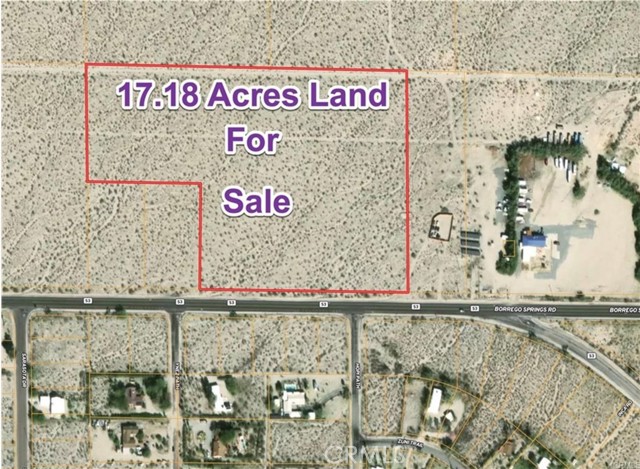 Discover 17.18 Acres in Borrego Springs – Prime Location with Endless Potential Just 5 miles from the heart of Borrego Springs, this expansive 17.18-acre property combines peace, convenience, and opportunity. With direct access from a county-maintained paved road, the lot offers an almost flat terrain—perfect for building your dream project. Zoning allows for a variety of uses including: Residential: Single-family dwellings Civic: Essential services such as fire and law enforcement facilities Agricultural: Horticulture, tree crops, row/field crops, and limited packing/processing Utilities are within reach—water service available from the Borrego Water District and electricity nearby—making connections to essential services smooth and convenient. The property is ideally situated just two lots away from the American Legion Post and close to the renowned La Casa del Zorro Resort, providing a touch of local charm and convenience. Panoramic views of the surrounding desert and mountains offer a serene backdrop, creating an ideal setting for residential or agricultural development. Buyer to verify all zoning, utilities, and property details through public records. Don’t miss this rare opportunity to own 17+ acres of Borrego Springs’ natural beauty with convenient proximity to town amenities!