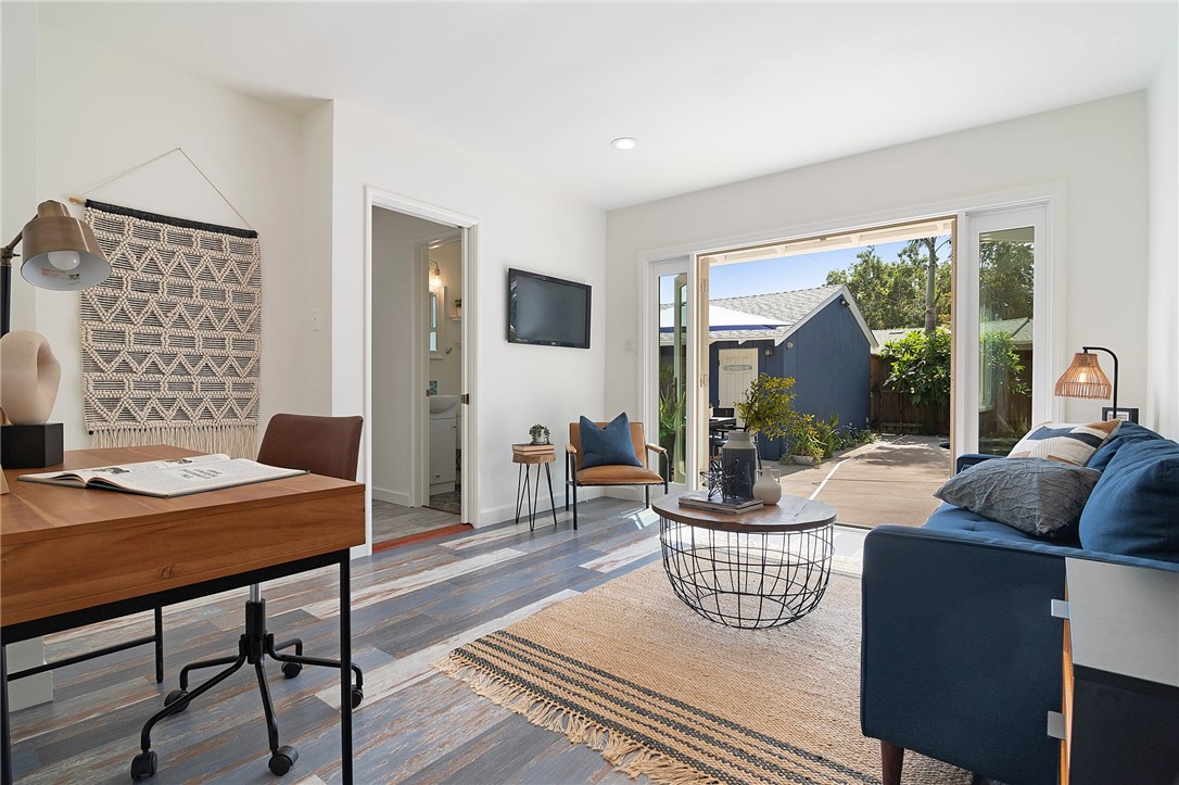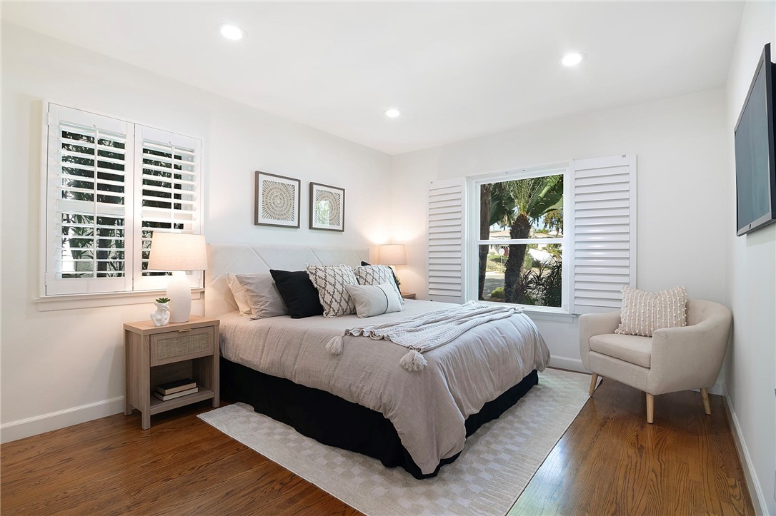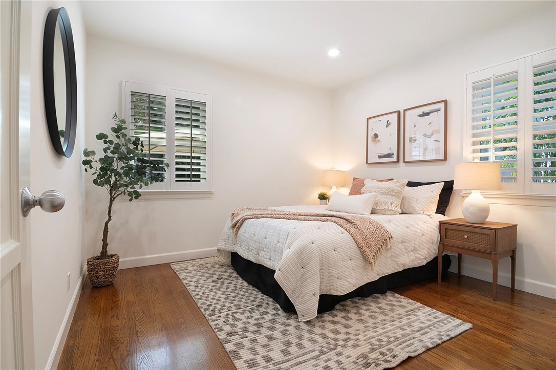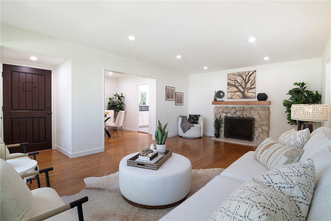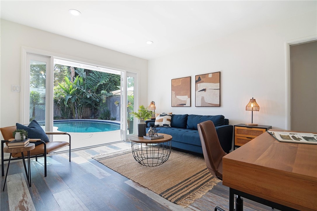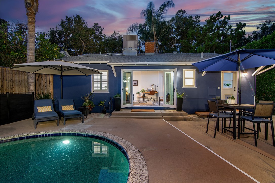 On a pretty tree lined street, this mid century pool home in the Rancho Equestrian District has been completely remodeled and upgraded and is strolling distance to Disney. Gorgeous curb appeal leads you into a modern contemporary home, with an ideal circular floor plan. The living room with large picture window (to watch the parade of horses go by) has a fireplace and opens to the dining room. The newer chef’s kitchen features soapstone Quartz counters, glass tiles, and a full suite of appliances including a drawer microwave and wine fridge. Hardwood floors throughout with the bedrooms also having plantation shutters. The well-appointed primary bath with marble counter has a deep soaking tub. The best part of the day: throw open the French doors to your tropical paradise with Hawaiian inspired landscaping and enjoy morning coffee or cocktails by the heated pebble-tec pool. Exceedingly private, the backyard has 8 foot Redwood fencing, a 33 Ficus hedge and a wall of Hollywood Juniper. Newer roof, Milgard windows, and insulated attic. Updated electrical and lighting. 2 car detached garage. Blocks to cafés, coffee houses, shopping, tennis, ice skating, basketball courts and children’s playground, parks and LILA private school. Minutes to DTLA. Close to Griffith Park (quick access over the horse bridge to 50 miles of trails), the Equestrian Center and all the studios: Disney, Warner Bros, Nickelodeon, NBCUniversal. Legendary Burbank schools and services. The perfect neighborhood for living the good life!