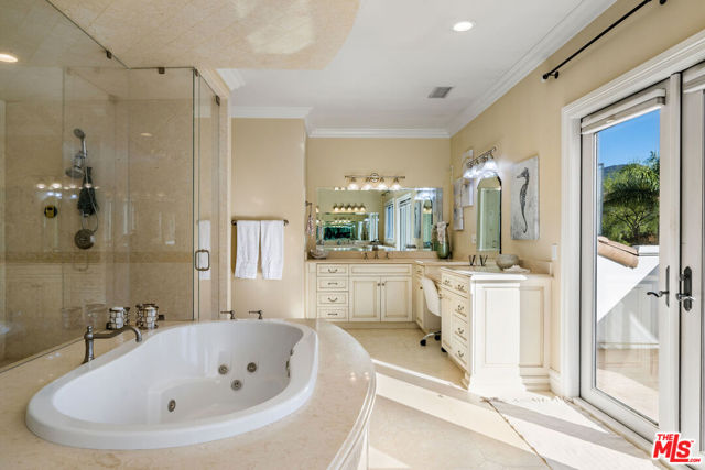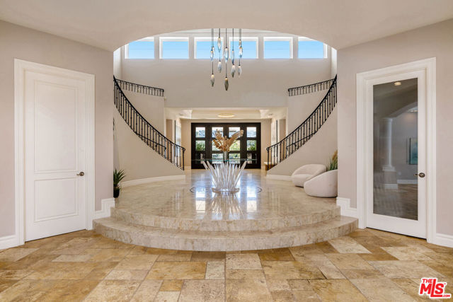 Tucked behind the coveted gates of Abercrombie Ranch Estates, an exclusive enclave of custom estates and celebrity residents, this breathtaking compound offers nearly ten acres of serene, unspoiled privacy. A long, private drive introduces the residence, revealing a grand architectural statement that blends timeless sophistication with the warmth of a true Calabasas retreat. Beyond the dramatic double glass doors, a soaring foyer unfolds around a sweeping dual staircase, setting an unforgettable tone of grandeur. To one side, the formal living room invites elegant gatherings beneath high ceilings and refined finishes; opposite, a gracious dining room provides the perfect setting for intimate dinners or lavish entertaining. At the heart of the home lies a chef's kitchen designed for both beauty and function, featuring custom cabinetry, stone countertops, an oversized island, and professional-grade appliances all flowing seamlessly into a welcoming family room with fireplace and views of the resort grounds beyond. Upstairs, the private primary suite serves as a tranquil sanctuary with its own sitting area, fireplace, and balcony overlooking the estate's lush landscape. The spa-inspired bath pampers with dual walk-in closets, a steam shower, and dual water closets. Three additional en-suite bedrooms surround a secondary lounge upstairs, while two more suites grace the main level, ideal for guests or multi-generational living.Outside, the grounds evoke the feeling of a five-star resort towering palms, vast lawns, and a glistening pool with Baja shelf and spa create an idyllic setting for leisure or large-scale entertaining. The outdoor kitchen and bar extend the home's social spirit, while the detached pool house, complete with living room, fireplace, bedroom, and bath, offers a private guest hideaway. With two double-car garages, panoramic views of the Santa Monica Mountains, and a solar power system with full-house generator, this rare estate combines luxury, self-sufficiency, and unparalleled privacy all just minutes from The Commons, fine dining, and the vibrant energy of Calabasas life. A true sanctuary where luxury meets peace, sophistication meets seclusion, and every moment feels worlds away yet effortlessly close to everything.