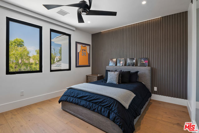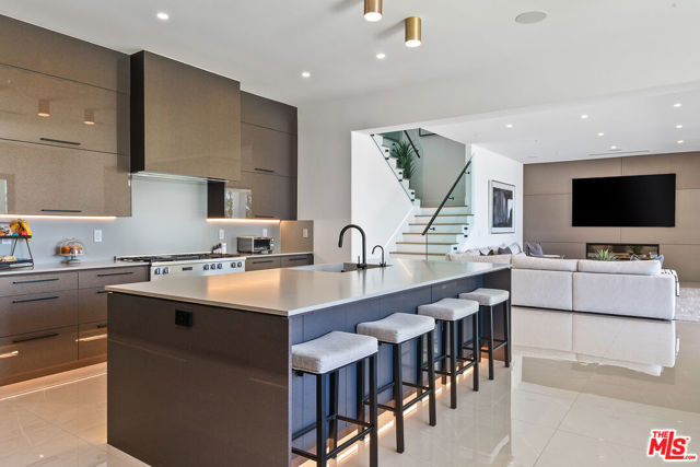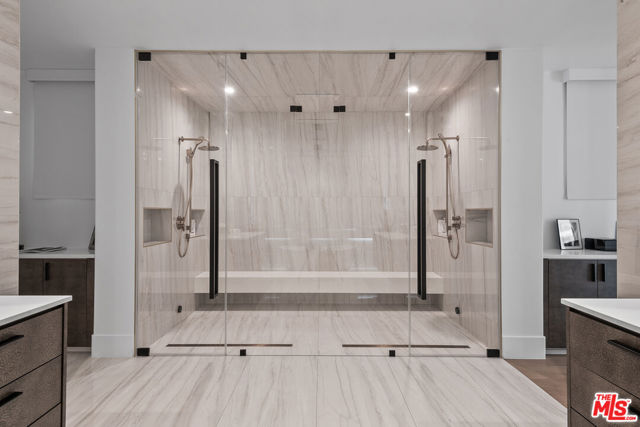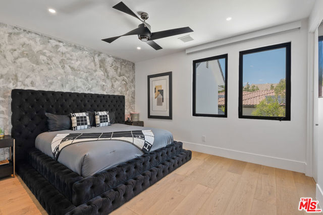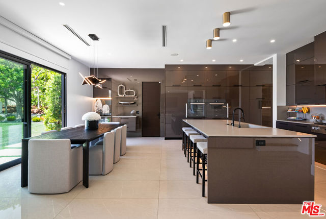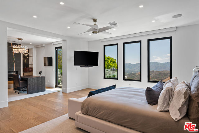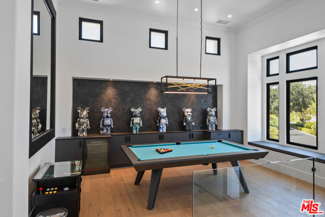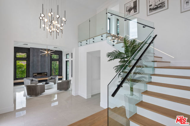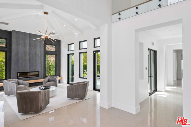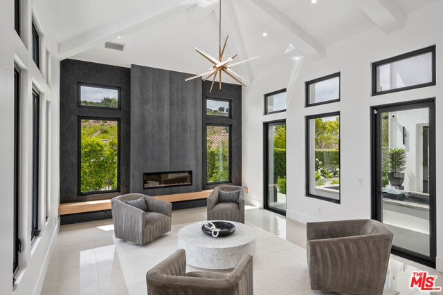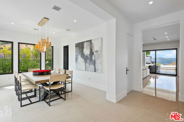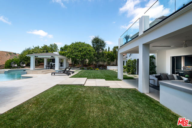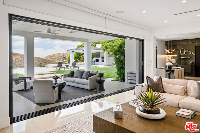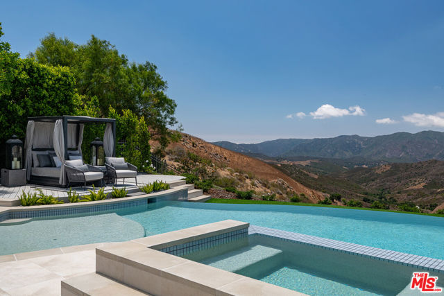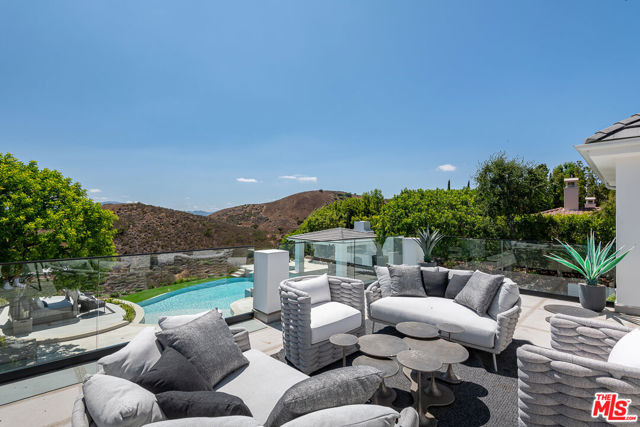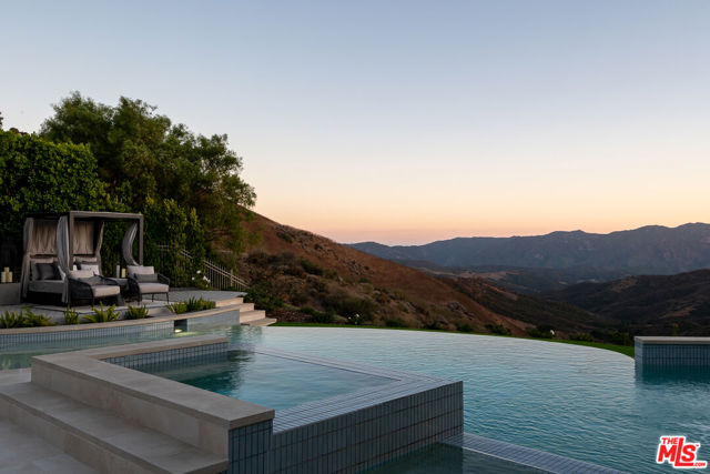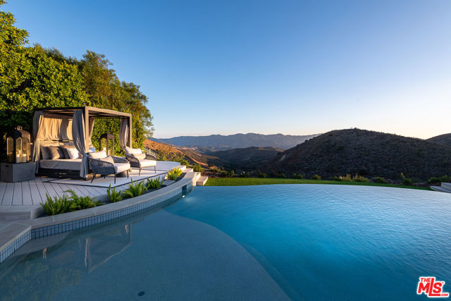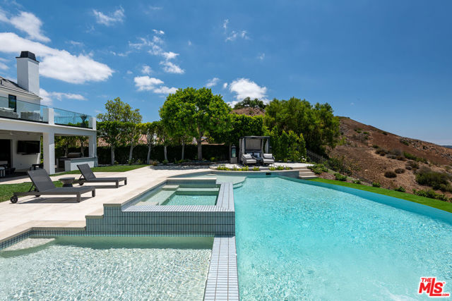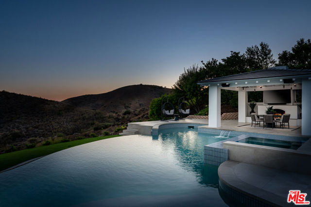 An extraordinary fusion of refined design and uncompromising craftsmanship, this fully reimagined modern estate in Calabasas sets a new standard for luxury living. Situated on a coveted view lot, this show-stopping residence has been transformed with a curated blend of bold architecture, top-tier finishes, and seamless indoor-outdoor flow offering an elevated lifestyle of sophistication and ease. Upon entry, you're greeted by expansive open living spaces adorned with brand-new designer flooring and striking iron-framed doors and windows that flood the interiors with natural light. The stunning chef's kitchen, outfitted with custom Miele built-ins, is a sleek centerpiece for both everyday living and elevated entertaining. Floor-to-ceiling pocket doors fully retract, unveiling a resort-style backyard with sweeping vistas, an infinity-edge pool, spa, baja shelf, and a covered casita with fireplace perfect for alfresco dining or relaxing beneath the stars. The primary suite is a serene sanctuary with spectacular views, two custom walk-in closets, and a spa-inspired bathroom that features radiant heated floors, floor-to-ceiling mirrors, ambient lighting, and an oversized steam shower for ultimate relaxation. A state-of-the-art home theater with immersive 8K projection delivers a cinematic experience beyond compare, while a full-property Sonos audio system, indoor and outdoor TVs, and new amplifiers provide entertainment throughout. Every detail of this estate has been elevated with thoughtful upgrades. The exterior has been transformed with new landscaping and landscape lighting in both the front and back, along with newly installed water fountains and tranquil features that enhance the ambiance. The entire home has been freshly painted inside and out, and the newly refinished driveway and courtyard now showcase custom tile and elegant hardscape design. Additional highlights include a brand-new soft water and saltwater filtration system, new pool equipment, and an advanced surveillance camera system with alarm integration for top-level security. The spacious garage has also been upgraded with new custom doors, high-end epoxy flooring, and built-in cabinetry for exceptional storage and style.This is a rare opportunity to own a one-of-a-kind modern estate in one of Calabasas' most sought-after communities where bold design meets effortless elegance, and every element has been masterfully executed for the most discerning buyer.