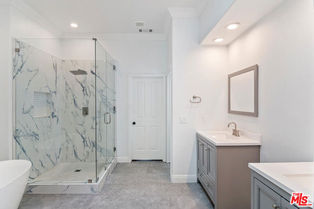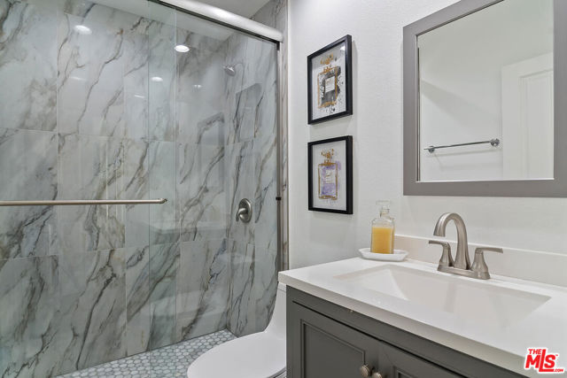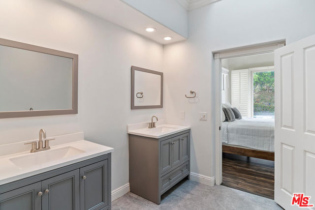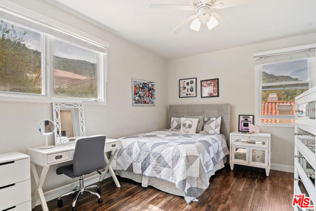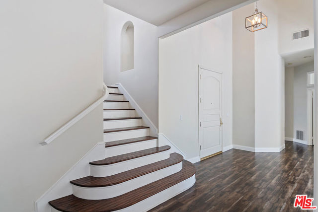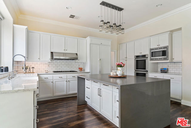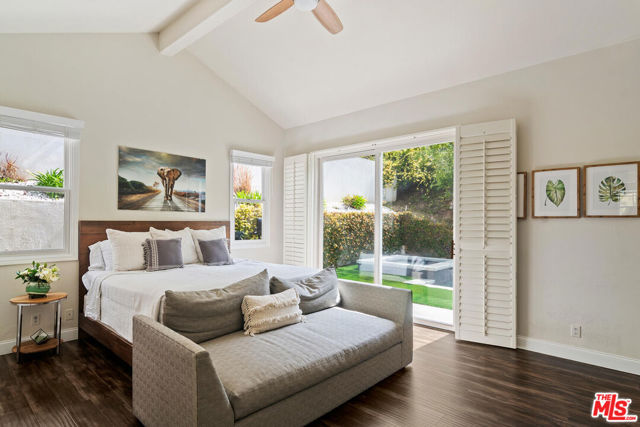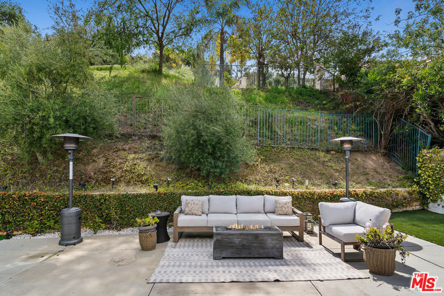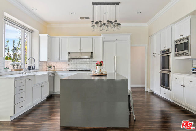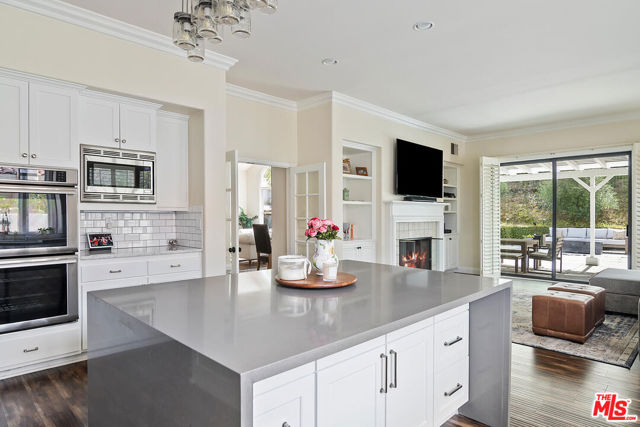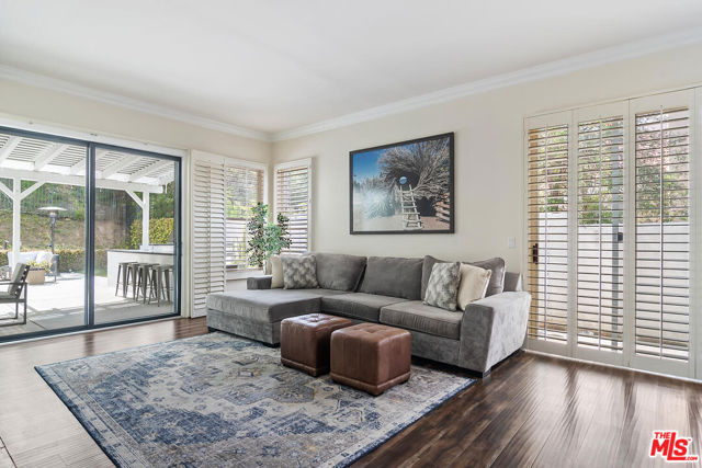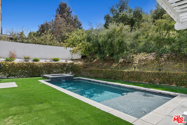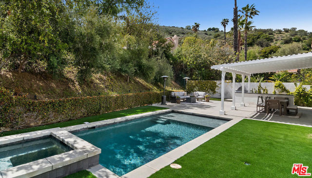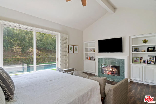Nestled within the prestigious guard-gated community of Calabasas Park Estates, this stunning residence boasts incredible curb appeal, a spacious motor court driveway, and a newly updated backyard with pool and spa. Thoughtfully designed to live like a one-story home, the main level features the primary suite, two additional bedrooms, and expansive living and entertaining areas.The charming exterior is enhanced by beautiful windows, gorgeous landscaping, and a stately entry door that welcomes you inside. The light-infused interior is a serene retreat, with soaring ceilings and an elegant arched window that frames the lush outdoor scenery. French doors lead from the formal living and dining rooms into a spacious family room with a cozy fireplace, seamlessly connecting to the newly remodeled gourmet kitchen. Designed for both beauty and function, the designer-inspired kitchen showcases decorative quartz counters, subway tile backsplashes, white cabinetry, and premium Viking appliances, including a built-in refrigerator, range, dishwasher, and microwave. The private primary suite offers a tranquil sanctuary, highlighted by a vaulted ceiling, fireplace, custom built-ins, and a spa-like newly renovated ensuite bath with dual sinks, a separate shower, a large soaking tub, and a walk-in closet. Downstairs are 2 additional bedrooms. Upstairs, two additional bedrooms, a full bath, and a bonus room with lofted ceilings and built-ins provide flexibility for work, play, or guest accommodations. The totally transformed backyard is an entertainer's dream, featuring a sparkling pool, outdoor kitchen, and a covered trellis patio is the perfect setting for dining al fresco or unwinding in the serene surroundings. The elegant landscaping creates a private oasis, blending simplicity with sophistication. This home has solar! Set back from the street for ultimate privacy, this exceptional home offers a rare combination of charm, functionality, and luxury living in one of Calabasas' most sought-after communities.