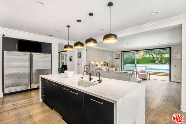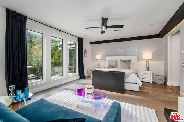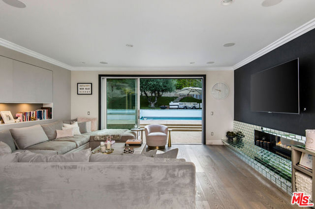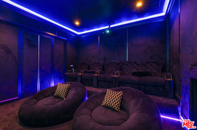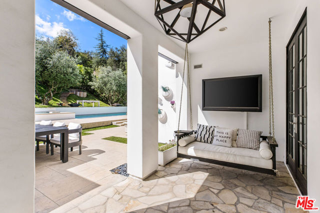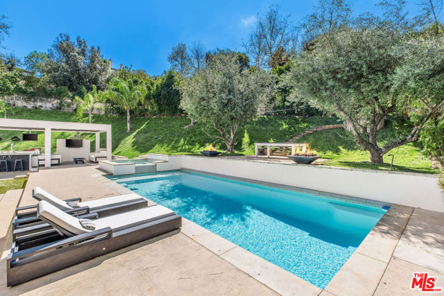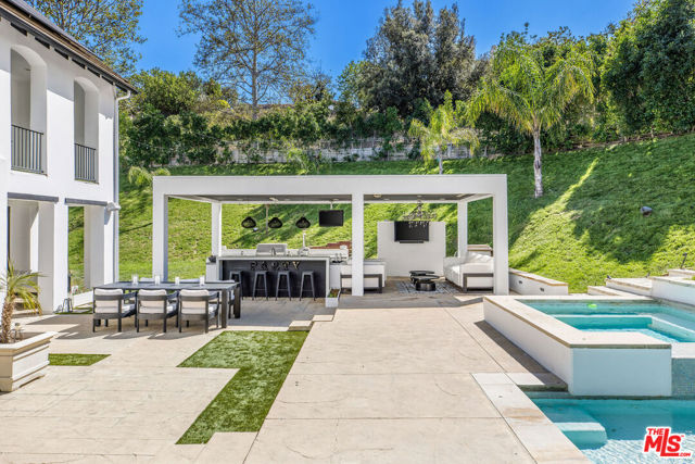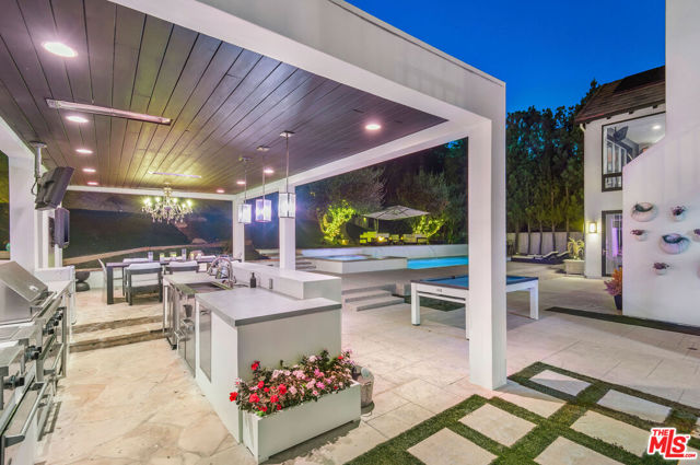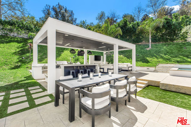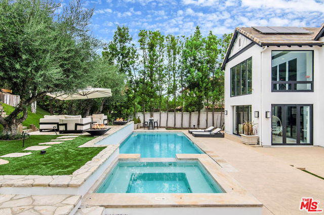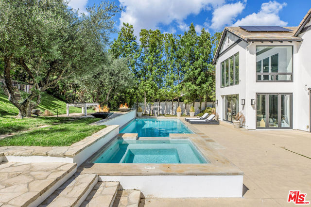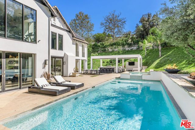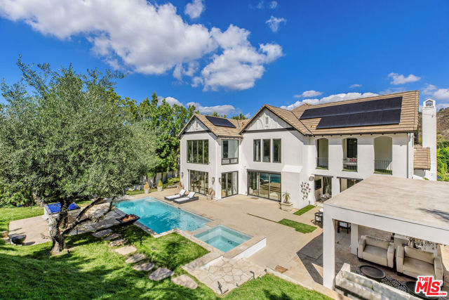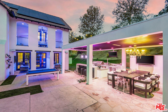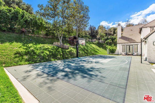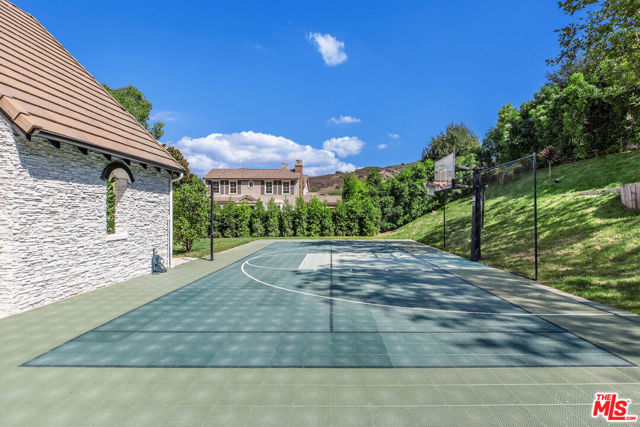 Situated on a coveted corner lot in the exclusive gated community of The Oaks, this stunning estate offers unparalleled privacy and luxury living. Spanning expansive wrap-around acreage, recently updated park-like landscaping and unmatched appeal, the property boasts exceptional outdoor features including a private sport court and a resort-style pool and spa. The outdoor entertaining area includes a covered lounge with a BBQ bar, as well as elevated hillside seating areas, offering a secluded retreat perfect for relaxation and entertaining. Inside, the home exudes stylish sophistication with a modern artistic flair. The expansive family room features a custom modern fireplace and seamlessly flows into a state-of-the-art kitchen, complete with a waterfall stone island bar and striking backsplash. A custom-designed entertaining bar lounge and tasting area further enhance the home's appeal for hosting. A thoughtfully designed kids' lounge is equipped with a fridge, play area, storage, and entertainment space, providing the perfect environment for family living. The lower level also includes a private-entry en suite bedroom, ideal for guests or extended family.The home's state-of-the-art theater room offers a custom cinematic experience, while the second level features four beautifully designed en suite bedrooms, each with unique styling. A cozy living room lounge and a private gym with floor-to-ceiling windows overlooking lush greenery add to the estate's appeal. The primary suite is a luxurious retreat, featuring a custom walk-in closet with accent lighting and a spa-like bathroom with double vanities, an oversized shower, a walk-in dry sauna, and a private glam space. This modern hideaway embodies sophistication and comfort, offering a rare opportunity to experience life in one of Calabasas' most sought-after neighborhoods.With exceptional amenities, ultimate privacy, and breathtaking views, this estate truly redefines luxury living behind the prestigious guard gates at The Oaks.