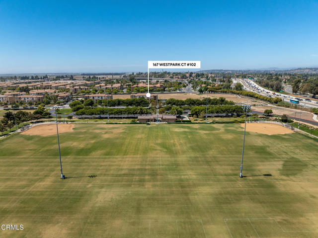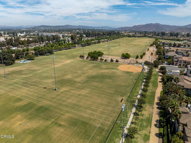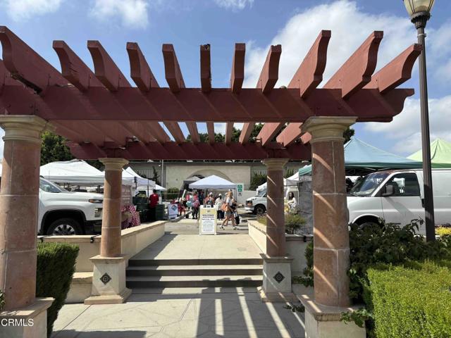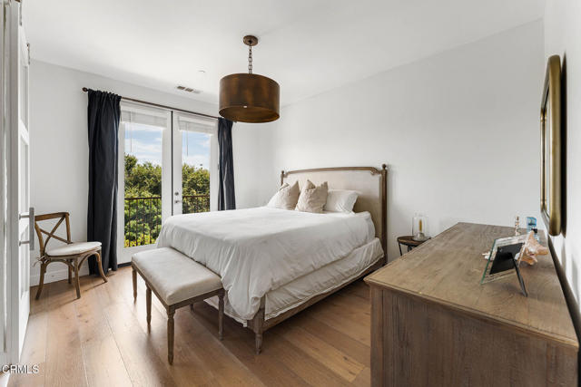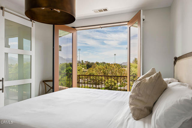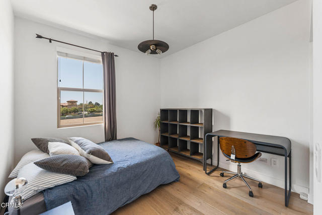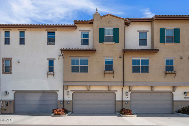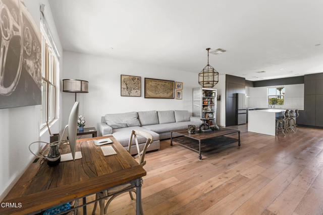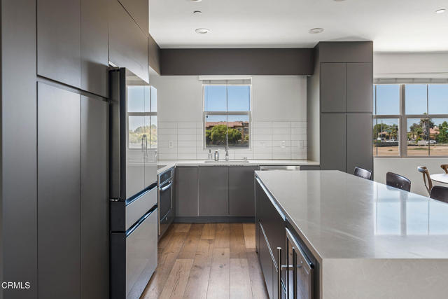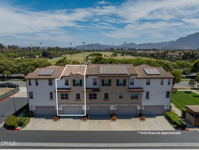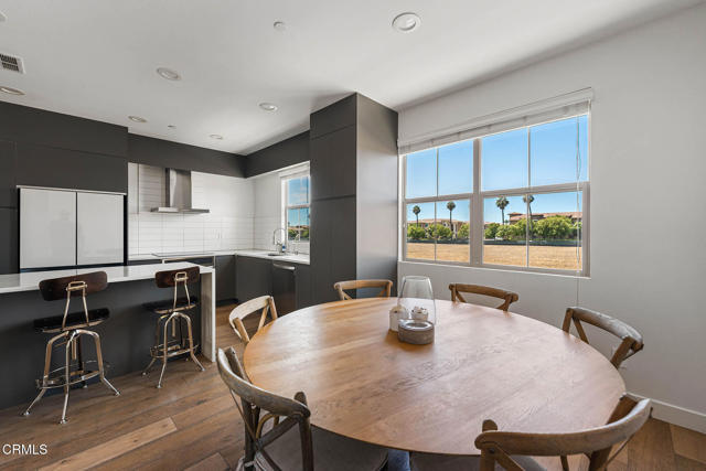 Welcome to this beautifully upgraded 4-bedroom, 3-bathroom townhome in Camarillo's Village Commons community. The open floor plan showcases wide-plank engineered wood flooring and recessed lighting, creating an inviting atmosphere and seamless flow between the living room, dining area and upgraded kitchen with quartz counters, stainless appliances and island with built-in wine fridge. A flexible 1st-floor bedroom/office opens to the front patio and BBQ, perfect for al-fresco dining. Upstairs, the primary suite features French doors to a Juliette balcony, a walk-in closet and modern bath. An additional balcony offers tranquil mountain views. Enjoy upgraded baths, views from nearly every window, owned solar and EV-ready 2-car garage. HOA covers water, trash and sewer. Nearby parks, schools, trails and downtown.