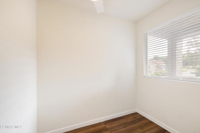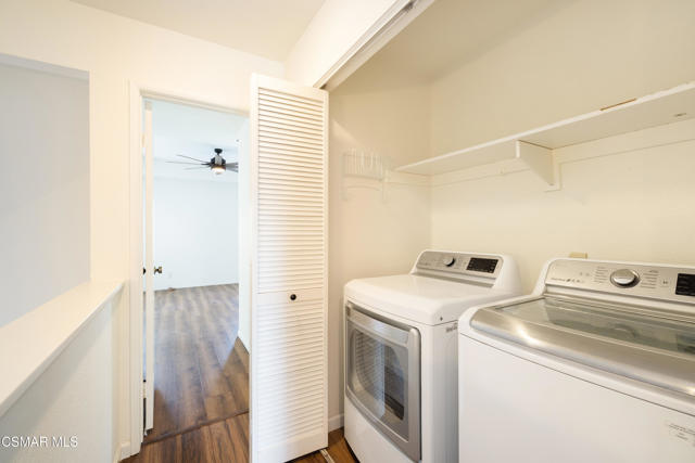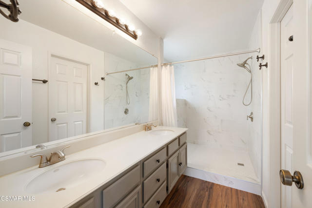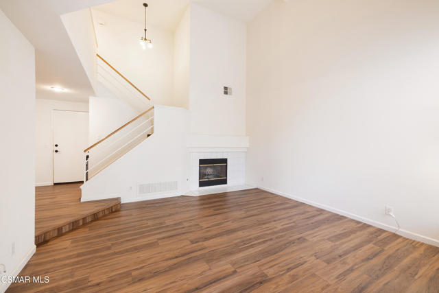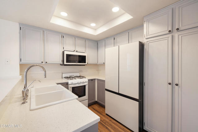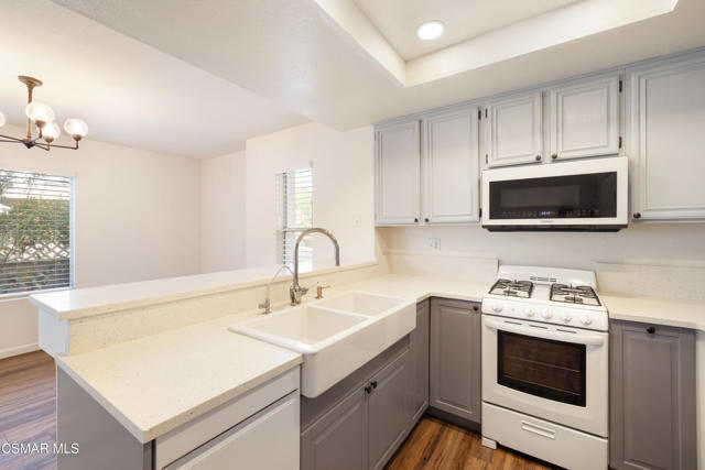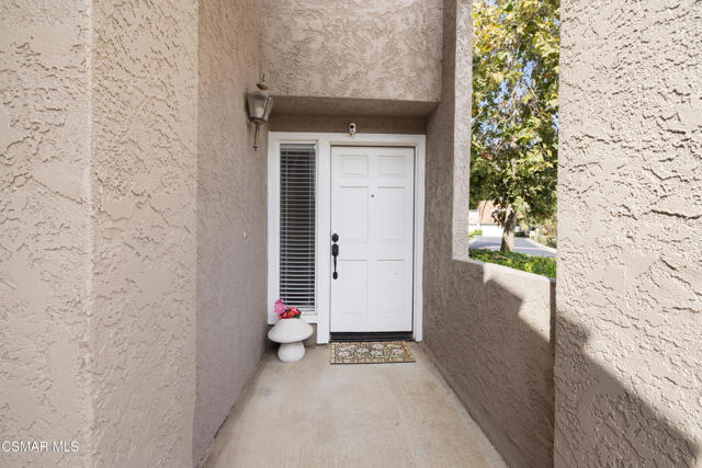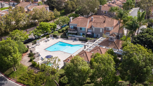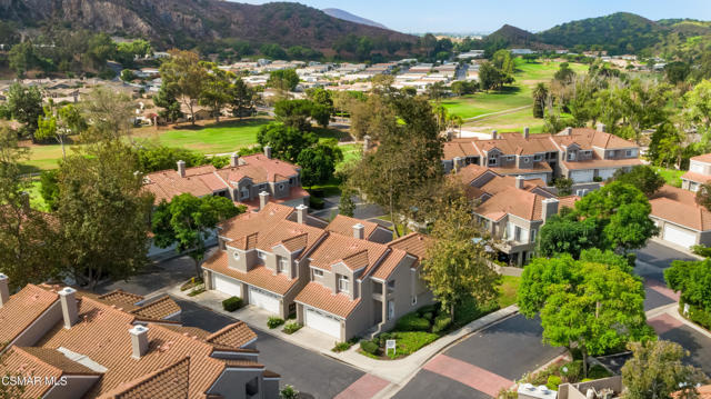 Welcome to this end unit 2-bedroom, 2.5-bath with attached 2 car garage townhome, nestled in the gated Camarillo Springs Miramonte community. With 1,465 sq ft of beautifully upgraded living space, this residence offers both comfort and style, an inviting open-concept design surrounded by spectacular mountain views and open grassy walkways.Step inside to soaring vaulted ceilings that enhance the spacious feel of the living room which features updated flooring and a cozy fireplace. The dining area opens to a beautiful kitchen with quartz countertops, convenient pull outs in cabinets and Samsung bespoke glass finish refrigerator and microwave. The owned water filtration system is conveniently installed under the kitchen sink.Upstairs, two spacious primary suites each include vaulted ceilings with ceiling fans and ensuite bathrooms with double vanities. One bathroom was recently remodeled with a huge walk-in shower. The other has a shower over tub perfect for a relaxing bath or a quick shower. The versatile additional room could be your home office. Convenient upstairs laundry with washer & dryer side by side.Enjoy the outdoors from your private patio surrounded by lush landscaping and fruit trees - tangerine, lemon and persimmon. Take advantage of community amenities including a pool, spas and nearby Camarillo Springs Golf Course. This move-in ready home blends elegance, functionality, and a highly coveted lifestyle.