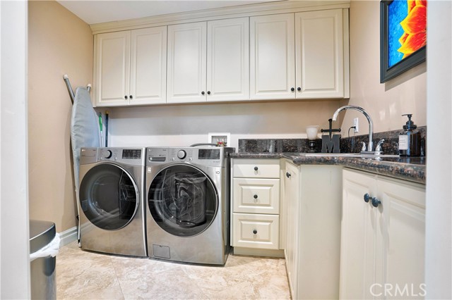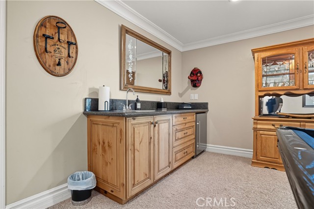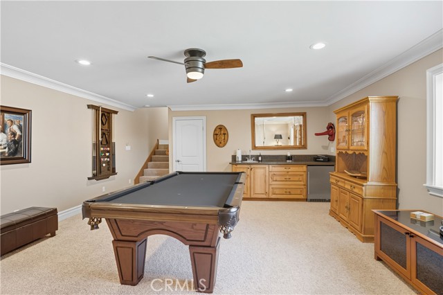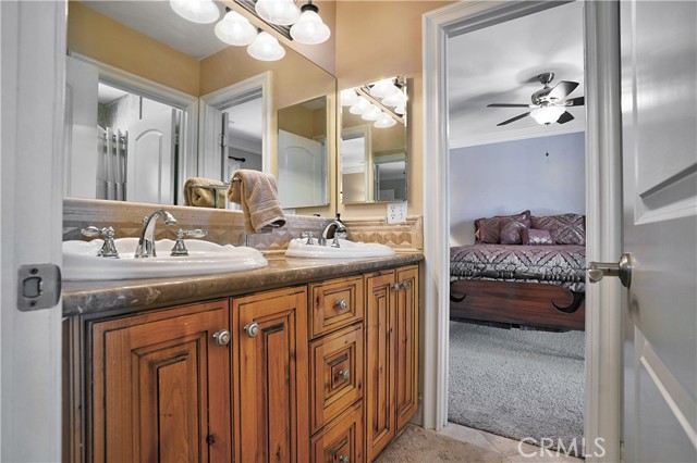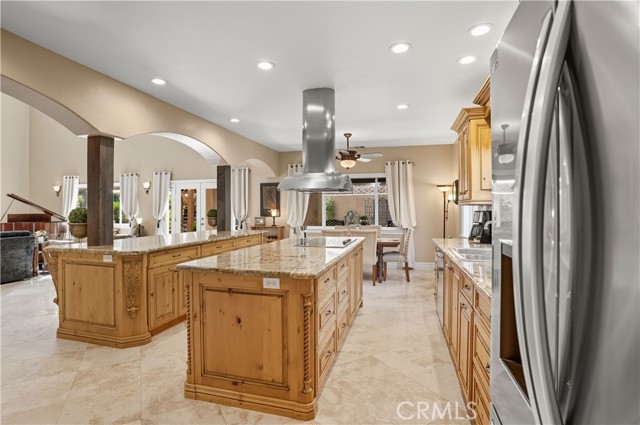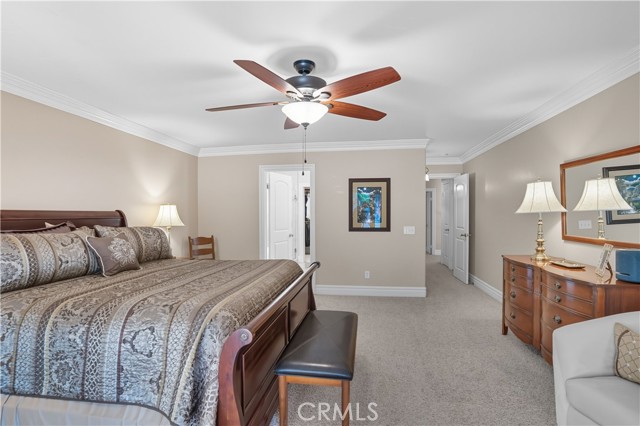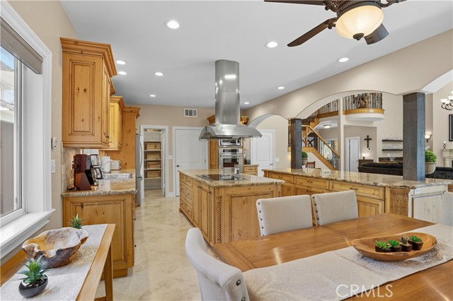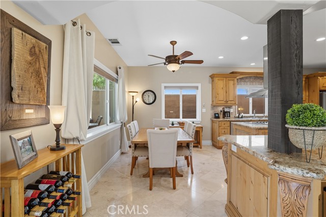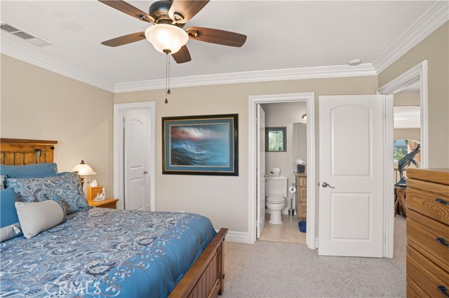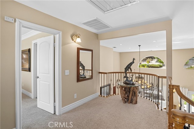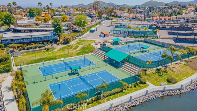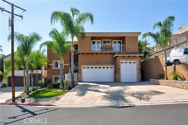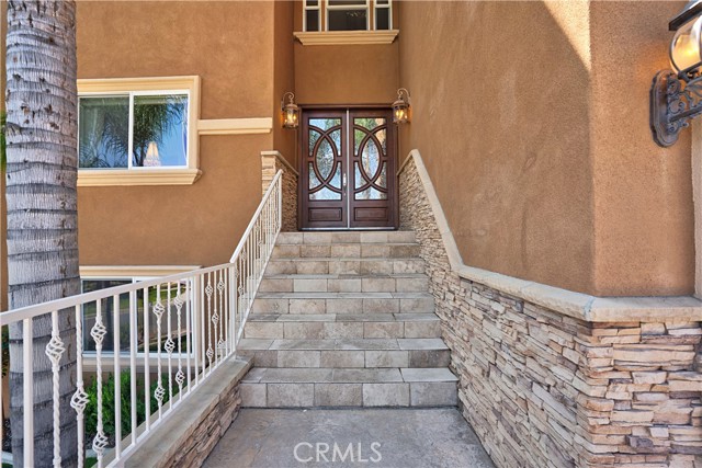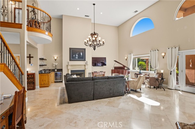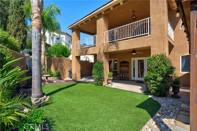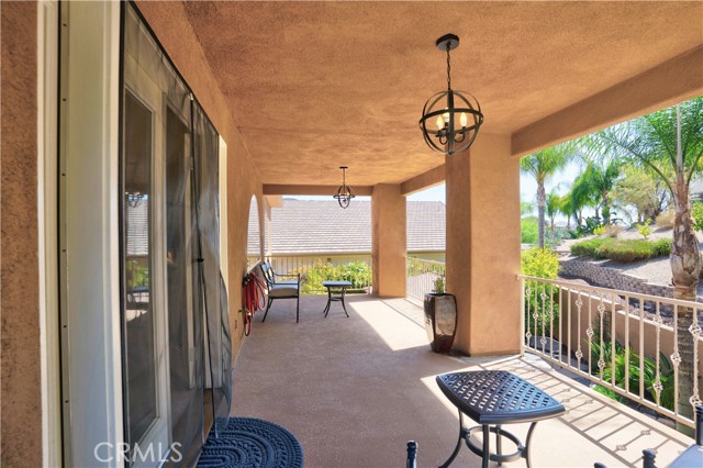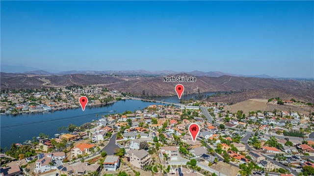 Welcome to this custom Mediterranean tri-level home in the coveted Canyon Lake community. Offering 5 bedrooms—each with its own private bathroom and walk-in closet—this 3,505 sq ft residence is situated on an 8,276 sq ft lot designed for elegance and easy living. From the moment you arrive, the curb appeal captivates with Mediterranean architecture, a 3-car epoxy-finished garage (including RV/golf cart space), lush palms on auto-drip, and astro turf with decorative rock for a true island vibe and low-maintenance lifestyle. A limestone-trimmed travertine staircase leads you to custom beveled glass double doors. Inside, soaring 19' ceilings and a stunning diamond-pattern travertine foyer welcome you into the grand great room—an open living and kitchen space designed for entertaining. The family room features a wood-burning fireplace, wet bar with wine refrigerator, custom shelving, all flowing seamlessly into a wow-factor chef’s double granite island Kitchen with stainless steel appliances to include: dual ovens, microwave, dishwasher, refrigerator, and dual sink. This dream entertaining kitchen is also well equipped with a walk-in pantry, side door to the epoxy-poured garage, and breathtaking backyard views. Step outside to a private retreat with a covered patio, gazebo, a new fountain, shed, and terraced garden spaces framed by astroturf and retaining wall with side yard ladder access to the fruit trees. The main level primary suite offers peaceful community views, a walk-in closet, and a spa-inspired bathroom with travertine finishes, tub/shower, and glass-enclosed walk-in shower. Laundry room features granite counters, a sink, and tons of cabinetry. The lower 3rd level game room/6th bedroom features a pool table, granite bar, sink, refrig., and walk-in closet & window with views. Upstairs, the Romeo & Juliet balcony overlooks the great room. Three additional bedrooms include two with a Jack-and-Jill bath and shared access to an expansive covered balcony. The upstairs primary massive retreat features its own balcony, spa-like bath with soaking tub, walk-in shower, dual vanities, and a custom closet organizer. Located within Canyon Lake’s 24-hour guarded gate community, you’ll enjoy resort-style amenities including a private 525-acre lake, an 18-hole SCGA-rated golf course with Restaurant, lakefront pool & clubhouse with banquet facilities, RV park, equestrian center, tennis, pickleball, beaches, 14 parks, happy camp, boat docks & more.