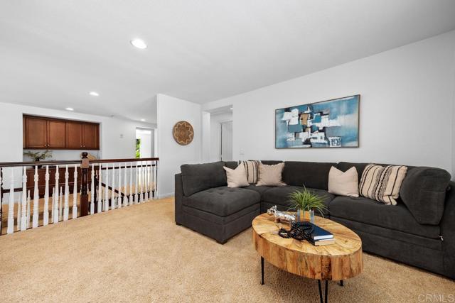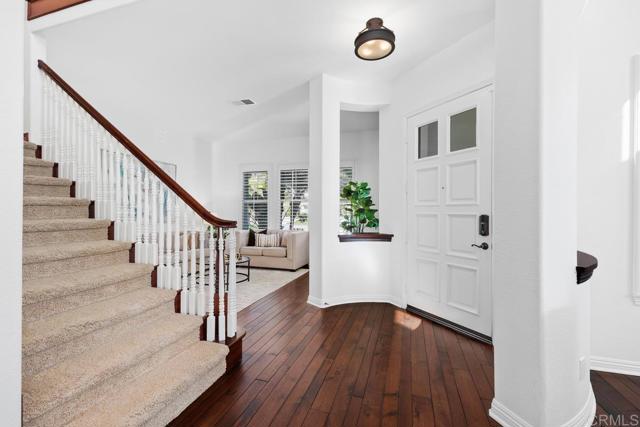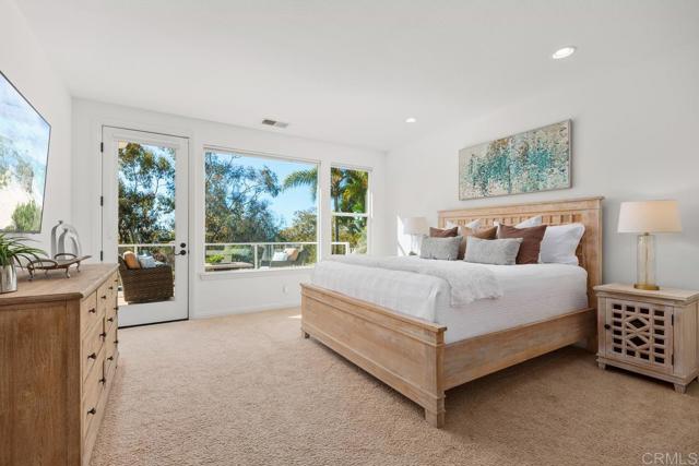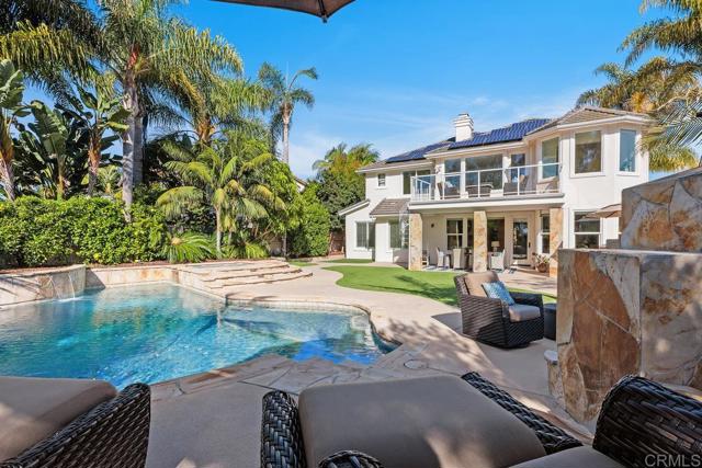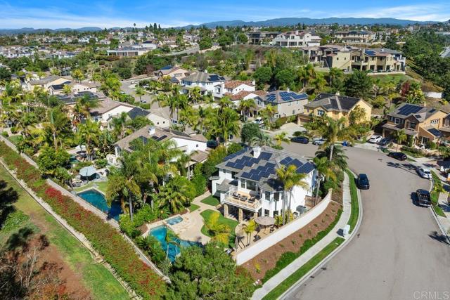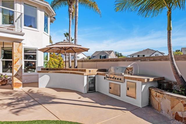 Ocean and Sunset/Sunrise Views from this stunning Standard Pacific, Bay Collection, Solar Paid Home. Resort-Style Living Experience with a Lushly landscaped Oasis entertainment design: Outdoor covered patio with recessed lighting, pre-wired for cable and speakers. Salt Water Pool/Spa (solar) and outdoor built in BBQ with enormous granite top outdoor island, includes beverage refrigerator. Custom built stand alone outdoor Fireplace (gas). Artificial grass in back yard. Cul-de-sac location. Main Floor downstairs has a bedroom/full bathroom ensuite and an extra large flex room which can be a bedroom/office/gym or ? Niche is ready for a closet if wanting a second bedroom downstairs. Upstairs has 3 bedrooms (one is Primary Bedroom, one is ensuite with full bathroom and a 3rd bedroom which has access to a hall way full bathroom. Additional loft with attached Office in the round could also be a bedroom. Upstairs has laundry room ready for side by side washer/dryer with built in sink. Primary Bedroom has huge cherry wood, custom organized walk in closet. Marble throughout primary bathroom with dual sinks and large roman tub and separate shower. Enjoy sunsets and sunrises off of Primary Bedroom View Deck. Large Gourmet kitchen with stainless steel appliances, 5 burner stove top, cherry wood cabinets and granite counter tops with back splash. Beautiful, newly refinished walnut wood floors extend to most of the downstairs main level. Double Oven, built in Microwave and refrigerator. Garage features extra storage cabinets. Property is on large .39 acre lot! Just .3 miles to Award winning Pacific Rim Elementary School and less than a mile to Poinsettia Park!