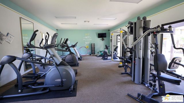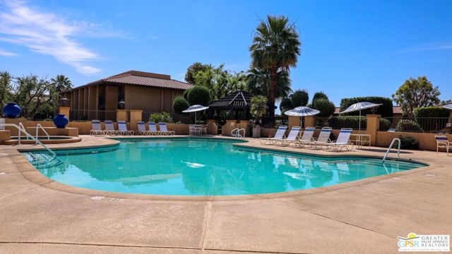 Welcome to Cathedral Springs! A vibrant and well maintained complex of 248 homes in a gated community conveniently located near dining, shopping and local amenities. This two bedroom lower level home is perfect for a homeowner not interested in lugging groceries, etc. up stairs. The kitchen, right off the dining area, boasts an open concept with stainless steel appliances. The master bedroom features its own en-suite bathroom and opens out to a patio that is perfect for enjoying morning or evening beverages while overlooking the tranquil grounds. One closet has hook ups for a stacked washer and dryer. Located just steps from one of four pools, this complex offers well-maintained open spaces, Barbeque area and a fitness center. This is the perfect combination location, serenity and desert lifestyle!