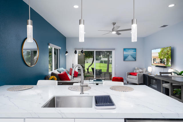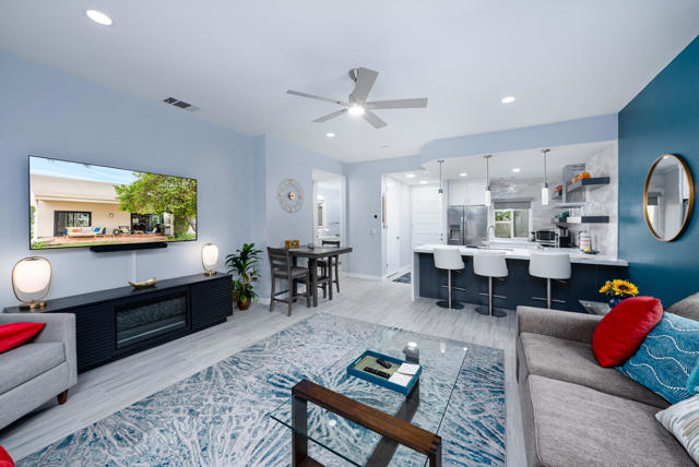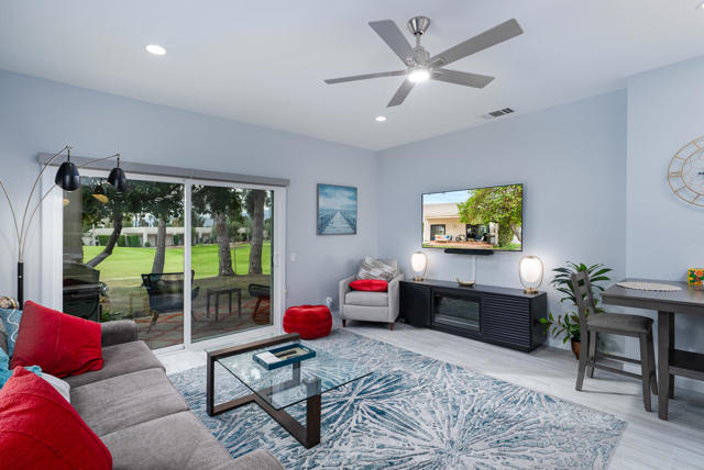 NEWLY REMODELED!!! Be the first to enjoy this completely remodeled, Southwest facing cul-de-sac condo located on the Lagos #5 golf hole. Every detail has been thoughtfully designed and executed to surround you or your seasonal tenants in luxury. Property is currently a seasonal rental and has an excellent rental history with on-site management. Available now to purchase and move in prior to any rental bookings for 2026. Desert Princess Palm Springs Resort is a full-service, gated community with 1200 homes, 35 pools and spas, 27 holes of PGA Championship golf, full clubhouse with bar, dining, pro shop and locker rooms. PGA professional golf instruction, full-service tennis and fitness center, full-service spa, pickle ball, walking trails and more. The Double Tree by Hilton resort is also on site.Just 10 minutes from Downtown Palm Springs and 20 minutes to Palm Desert El Paseo shopping. Stater Brothers grocery, Fed Ex Office, Post Office, Wal-Mart, Target, Trader Joe's and all major services are within 5-10 minutes.