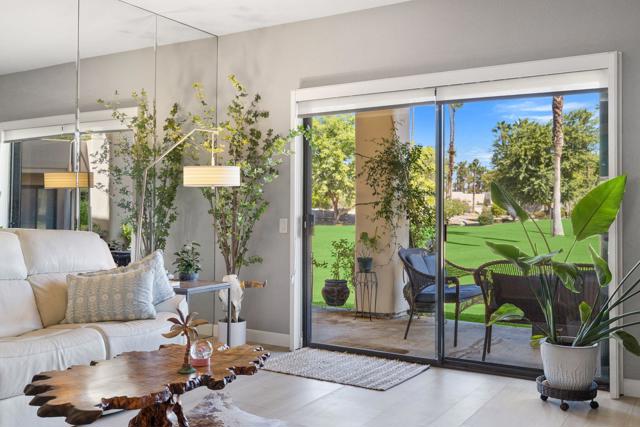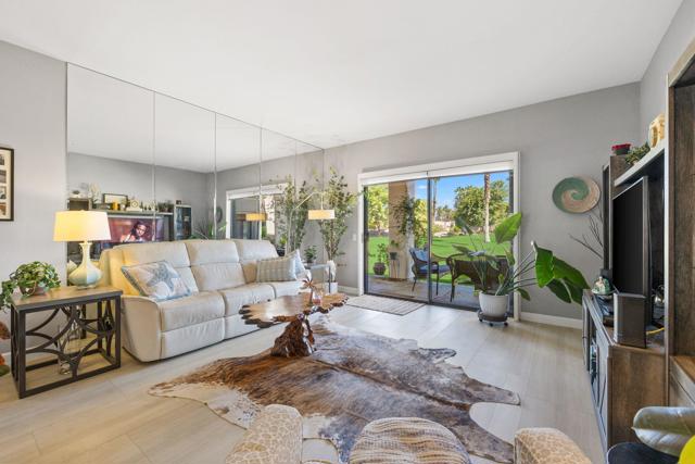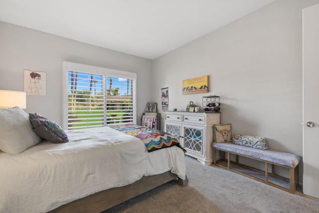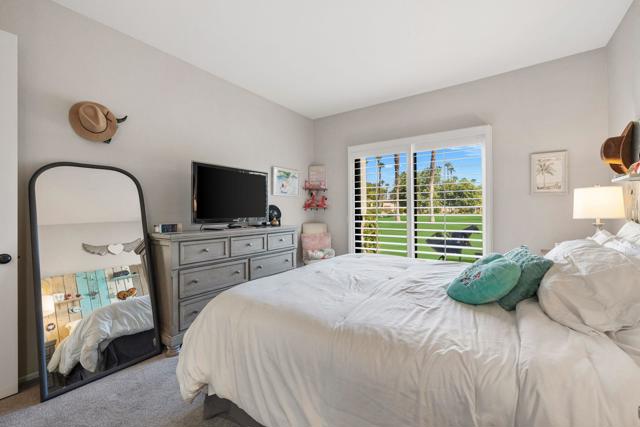 Highly sought after Alameda model at a great price! This condo has 2 primary suites and is a 2 bed / 2 bath unit with golf course view. Very light & bright with tall ceilings and newer laminate flooring in kitchen & living area. The kitchen has newer Stainless Steel appliances & a Farmhouse sink. There is a nice breakfast bar for additional seating. The living area is spacious and has great views of the golf course. The Bedrooms are both en-suite and very spacious with plantation shutters, and they have sliding glass doors that lead out to the huge covered back patio. The bathrooms have been beautifully remodeled with walk in marble showers, double vanity sinks & large walk in closets with built in shelving. There is a large stack-able washer & dryer inside the Condo. You can relax and enjoy bbqing while taking in the beautiful sunsets on either of your patios. Lots of outdoor living space! There's is a detached one car garage for parking or extra storage. The pool is just steps away. You'll be located just a couple of minutes by golf car from the clubhouse as well as the tennis, fitness and spa facilities. Plus it's just a minute from the side gate making entrance and exit from the club quick and easy. Desert Princess has 33 heated pools, a 27 hole golf course, 9 tennis courts, pickleball, bocce ball, fitness center, spa and an updated Clubhouse. Desert Princess is located just minutes from Palm Springs airport and has no flyover noise. Additionally, it is typically less than 15 minutes from the downtown Palm Springs!
