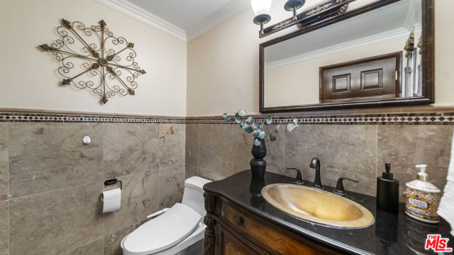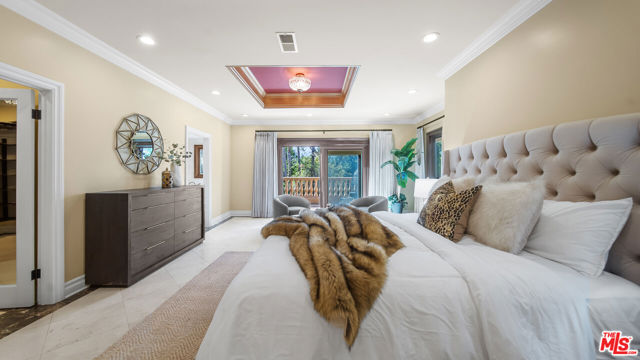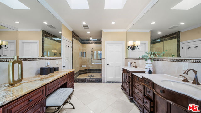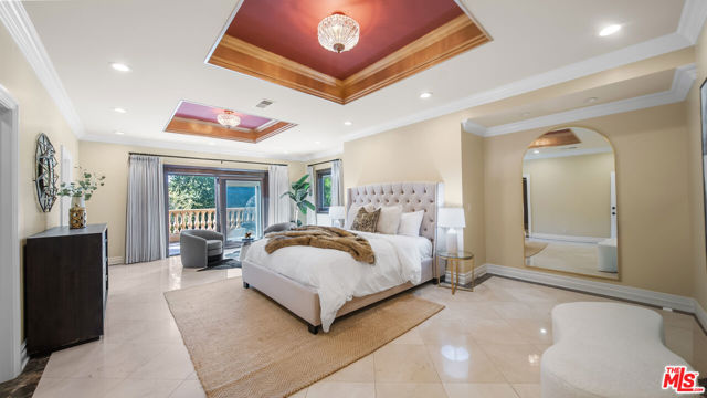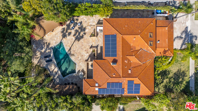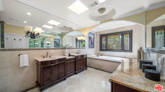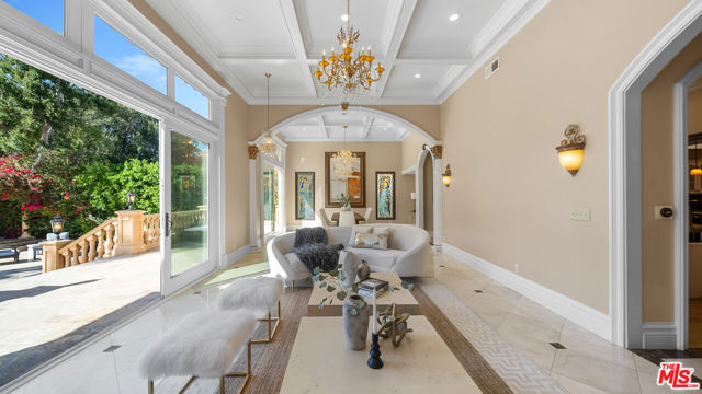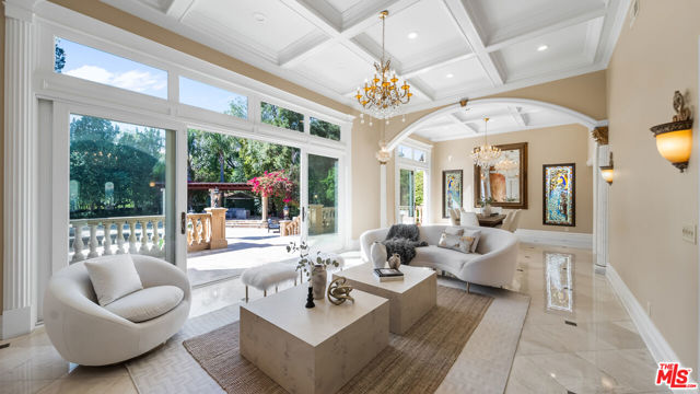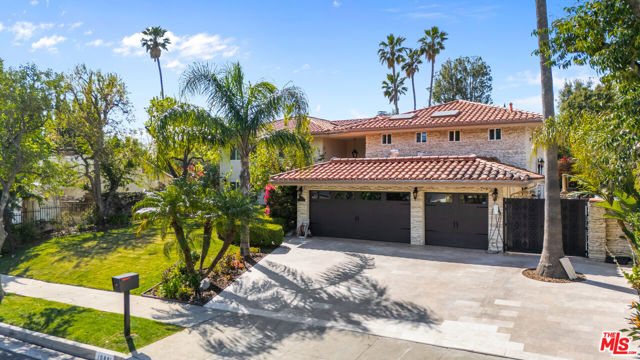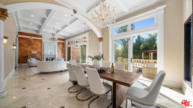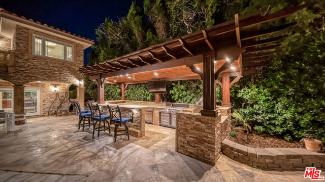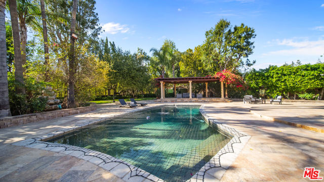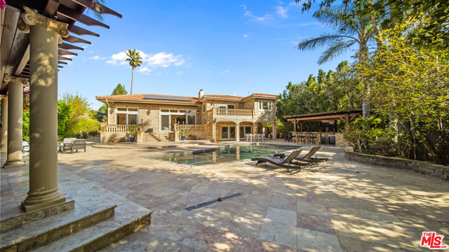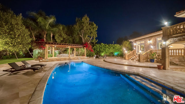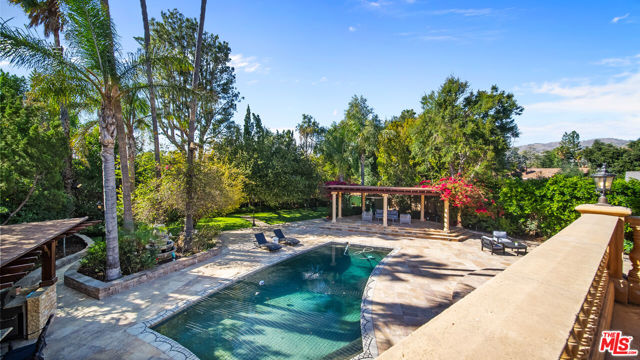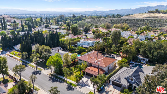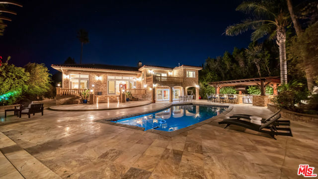 Exquisite Mediterranean Estate in Chatsworth! Welcome to this elegant, reimagined beauty in the heart of Chatsworth! Nestled on an expansive 18,000+ SQFT lot, this luxurious 5-bedroom, 4-bathroom residence offers nearly 4,300 SQFT of living space, showcasing high-end finishes and impeccable craftsmanship.From the moment you enter, you'll be captivated by soaring ceilings, stunning custom arches, and gleaming marble floors bathed in natural light. The state-of-the-art chef's kitchen is a true masterpiece, featuring a 6-burner gas Wolf range, built-in custom Sub-Zero refrigerator, oversized eat-in island, skylight, dramatic marble backsplash, and stainless steel farmhouse sink. Designed for grand entertaining, the formal living and dining areas boast coffered ceilings, Roman/Greek columns, dazzling chandeliers, and an elegant White Carrara marble fireplace. A second living room on the lower level offers a full wet bar, Italian-inspired fireplace, and custom sliding doors leading to the breathtaking backyard.Step outside to your private oasis, where travertine floors, an expansive patio, and a full outdoor kitchen create the ultimate indoor-outdoor living experience. Take a dip in the sparkling pool, surrounded by lush greenery and resort-style landscaping. The luxurious primary suite features a private balcony, generous walk-in closet, sunken jetted tub, glass-enclosed shower, and dual vanities with a makeup counter. With two additional bedrooms upstairs and two on the lower level, this home offers ample privacy and space for family and guests. Owned Solar! A custom 3-car garage with a workbench and storage completes this extraordinary home. This estate truly has it all elegance, space, and resort-style living! Don't miss this rare opportunity! Schedule your private showing today! CLICK ON THE VIRTUAL TOUR LINK FOR A FULL VIDEO.