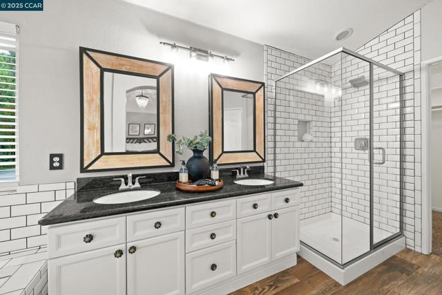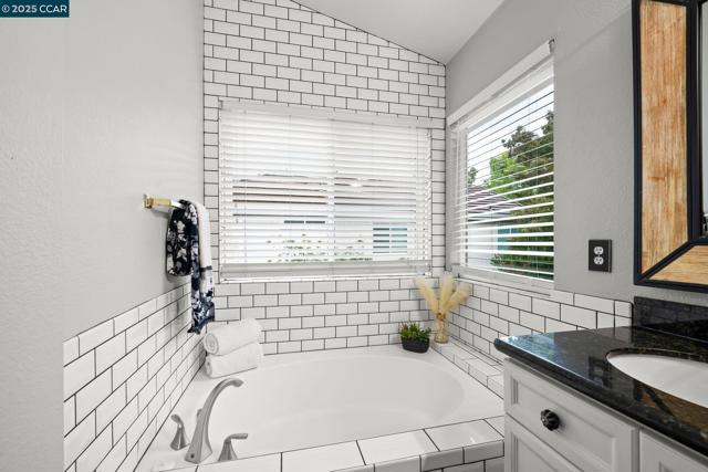 Stunning two story in Oak Hollow at Oakhurst Country Club nestled on a court location. Enter into the bright & airy living room featuring soaring ceilings, sunny windows flowing with natural light, a two-way fireplace & open flow to the formal dining area. Enjoy the eat-in kitchen with extended counter space, large windows with backyard views, slab granite countertops, ample cabinets & slider to the backyard. The spacious family room features an open flow from the kitchen & is adjacent to the updated half bath & laundry room. Upstairs enjoy the primary bedroom suite featuring vaulted ceilings & updated bath boasting a stall shower with tile surround, separate tub, dual sink/vanity plus walk-in closet. Two additional bedrooms upstairs plus an updated hall bath. The inviting backyard offers a patio area with built-in BBQ, professional hardscape and low maintenance landscape Great location close to community pool, downtown and trails.