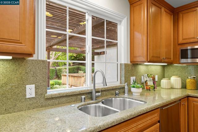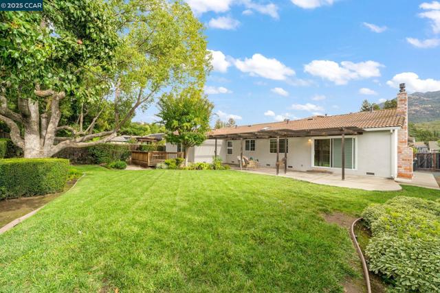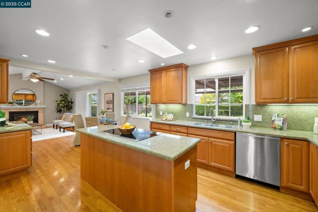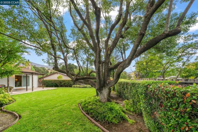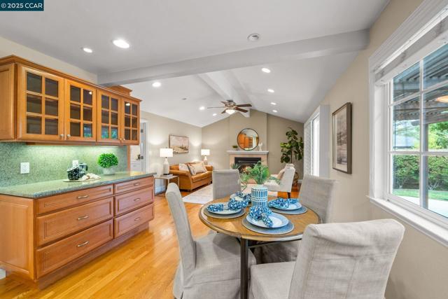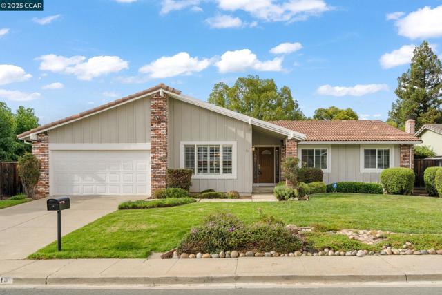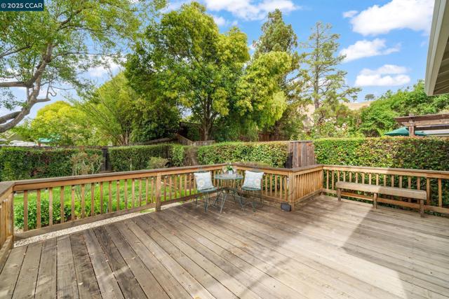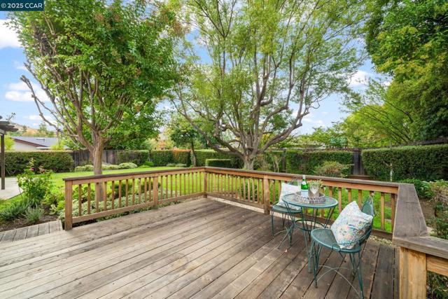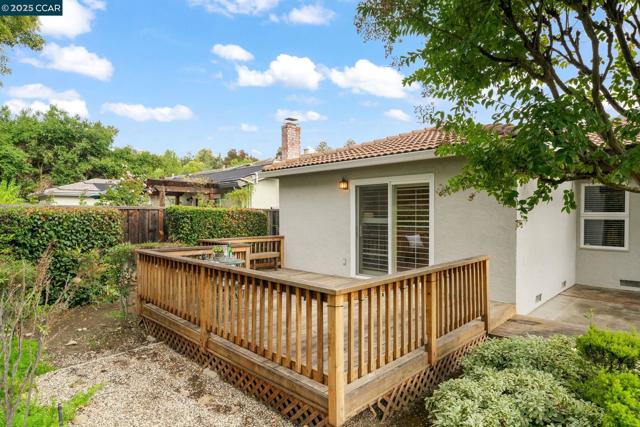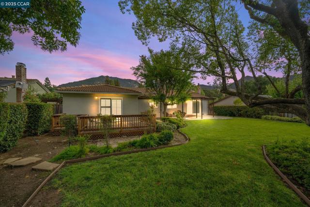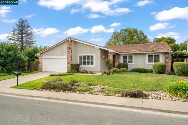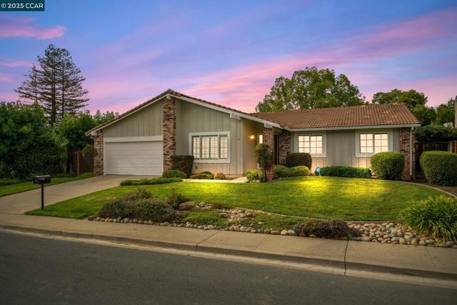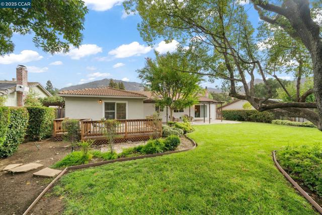 Charming & Updated Single Story Rancher in Regency Woods tucked away on a court location with Mt Diablo views! Living room offers semi vaulted ceiling and adjoins formal dining room. Gourmet kitchen features slab granite counters & island, ample cabinets, newer appliances & casual dining area with dry bar featuring slab countertop, display cabinets, and extra storage, perfect for coffee mornings or evening entertaining. Spacious family room includes wood flooring and cozy upgraded gas fireplace with slider to yard. Large primary bedroom offers crown moulding, dual closets with mirrored doors, lighted ceiling fan and slider to backyard private deck area. Primary bath boasts updated vanity with slab counters, dual sinks and built-in linen/display cabinet, tile flooring and an oversized stall shower with solid surround. Inside laundry room. Park-like backyard features professional landscape and hardscape featuring large covered patio, deck, lush lawn area, colorful flowers, multiple shade trees & ornamentals. Updates include: Dual pane windows, thick baseboards, wood floors, shutters, updated baths and more! This is a must see!