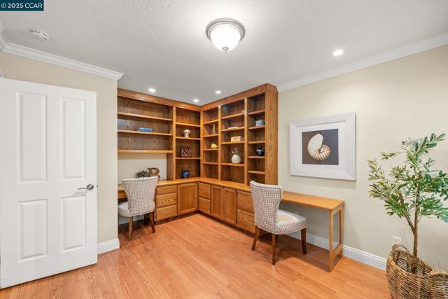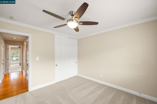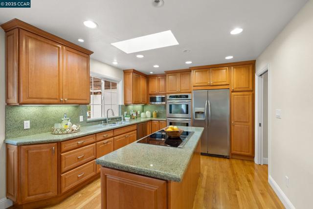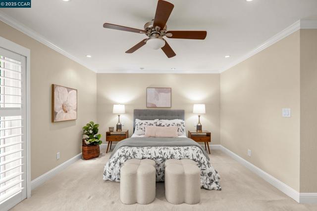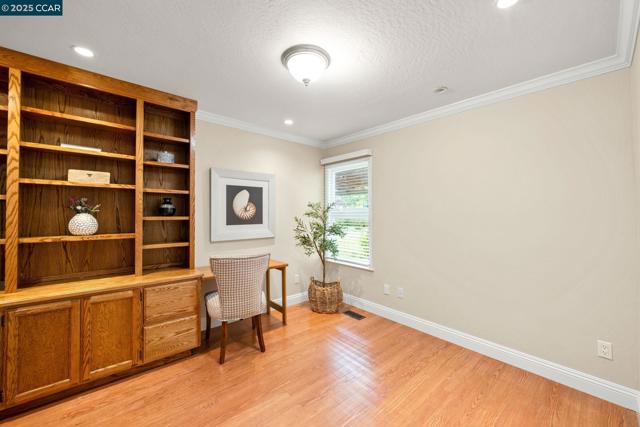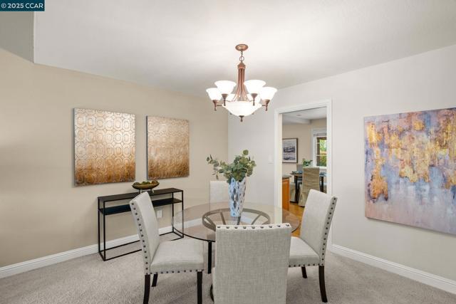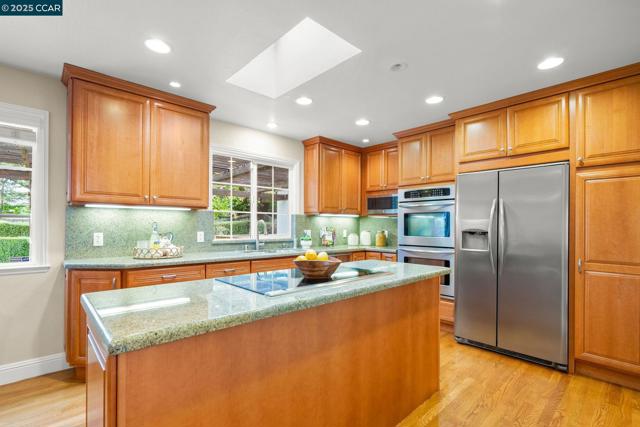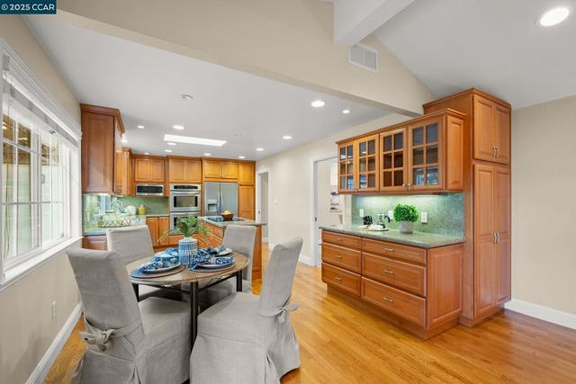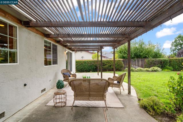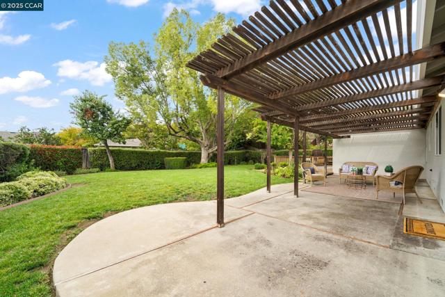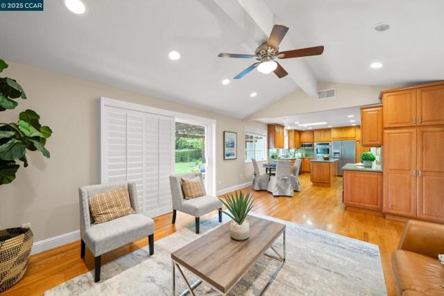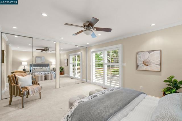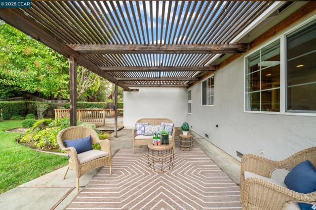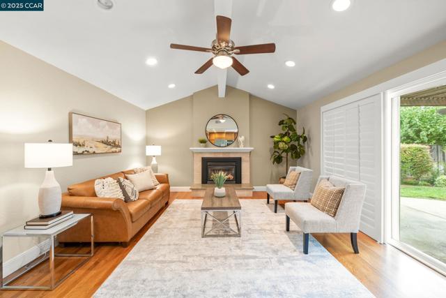 Charming & Updated Single Story Rancher in Regency Woods tucked away on a court location with Mt Diablo views! Living room offers semi vaulted ceiling and adjoins formal dining room. Gourmet kitchen features slab granite counters & island, ample cabinets, newer appliances & casual dining area with dry bar featuring slab countertop, display cabinets, and extra storage, perfect for coffee mornings or evening entertaining. Spacious family room includes wood flooring and cozy upgraded gas fireplace with slider to yard. Large primary bedroom offers crown moulding, dual closets with mirrored doors, lighted ceiling fan and slider to backyard private deck area. Primary bath boasts updated vanity with slab counters, dual sinks and built-in linen/display cabinet, tile flooring and an oversized stall shower with solid surround. Inside laundry room. Park-like backyard features professional landscape and hardscape featuring large covered patio, deck, lush lawn area, colorful flowers, multiple shade trees & ornamentals. Updates include: Dual pane windows, thick baseboards, wood floors, shutters, updated baths and more! This is a must see!