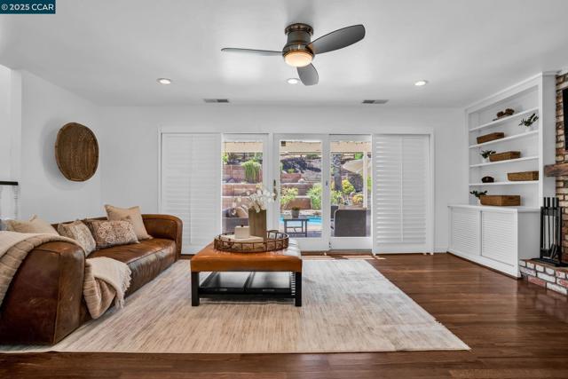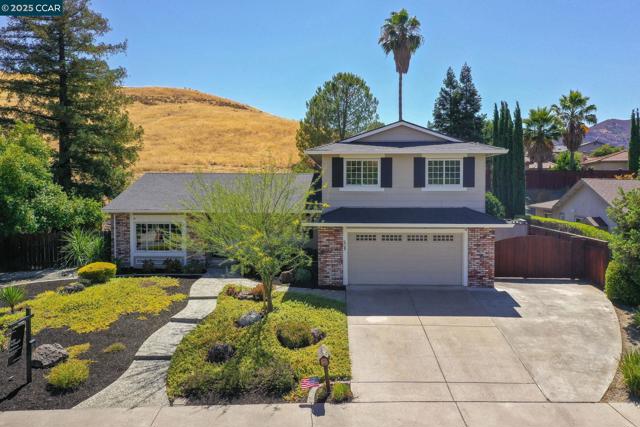 Welcome to your dream home! This beautiful 4-bedroom home plus a main-level office or optional 5th bedroom offers 3 full bathrooms and approximately 2,324 square feet of modern living space. Step inside to an elegant formal living room with soaring vaulted ceilings, a built-in entertainment center, and a formal dining area perfect for gatherings. The chef’s kitchen is a showstopper—featuring stainless steel appliances, a gas range, quartz countertops, and upgraded white cabinetry with plenty of storage. A spacious dining nook with sliding glass doors opens to the beautifully landscaped backyard. Relax in the cozy yet large family room complete with a fireplace, built-ins, and direct access to the covered patio, creating a seamless indoor–outdoor flow that’s perfect for entertaining. Upstairs, the primary suite offers dual closets (including a walk-in), and a luxurious ensuite bathroom adorned with authentic Venetian plaster by an Italian artist. Engineered hardwood flooring flows through most of the home, adding warmth and elegance. Enjoy your private backyard oasis featuring a sparkling pool, soothing hot tub, and a cool deck patio, grand views of Mt. Diablo, large grassy area, fruit and citrus trees, and mature shade trees for comfort and privacy. Large side yard for toys.