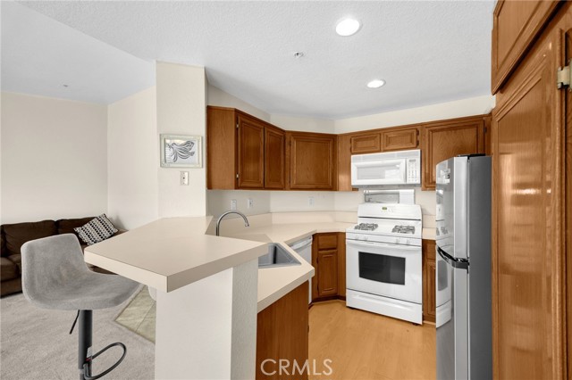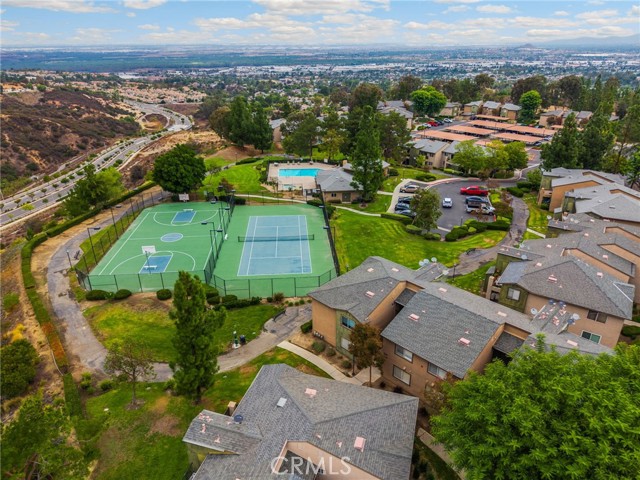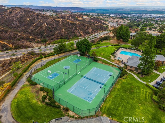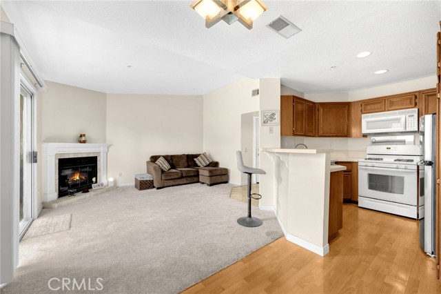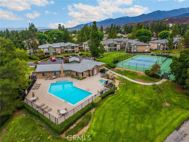 Uncover your dream home in this beautiful, ready to move in, top-floor condo in the gated Crowne Villas community, perfectly nestled above the serene, picturesque hills of Corona near Green River (Ontario and Avenida del Vista). This bright, open-concept one-bedroom, one-bath upstairs unit exudes warmth and charm, featuring a cozy, fireplace, open floorplan, and a stylishly updated bathroom with new fixtures and tile. The open kitchen flows into a breakfast/dining area and connects to a private patio, ideal for relaxing and enjoying breathtaking panoramic views of the lush, mountainous community. Equipped with modern conveniences, the unit includes a dishwasher, stove, microwave, fridge, and stackable washer/dryer. Ample storage enhances everyday living, while the serene, quiet setting is perfect for those seeking peace after a busy day. Community amenities elevate your lifestyle with a clubhouse, sparkling pool, spa, gym, tennis and volleyball courts, a dog park, scenic walking paths, and inviting benches to soak in the stunning hillside views. This upstairs unit in a two-story building offers a carport parking spot and ample open parking for guests. Located close to shopping centers, schools, and parks, this condo offers resort-style living in a tranquil, gated community.