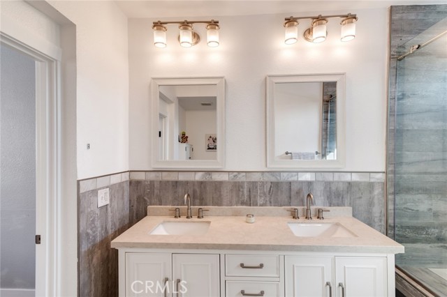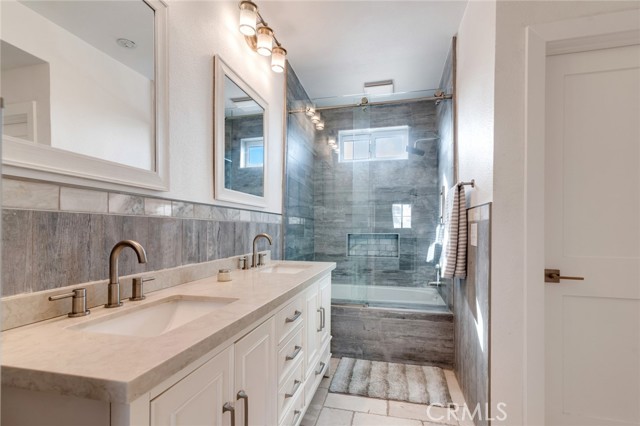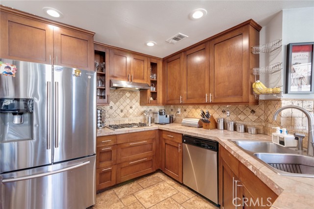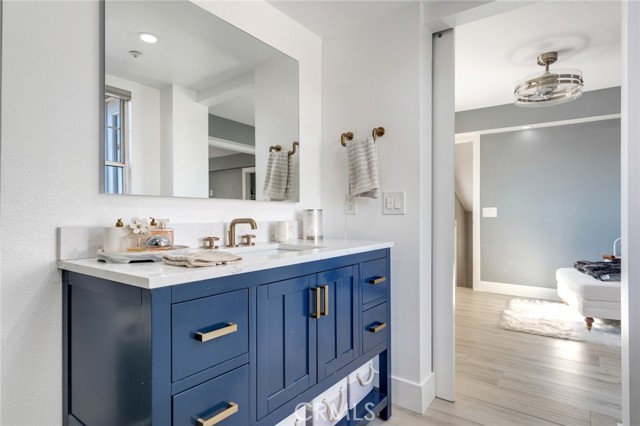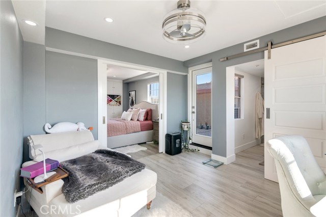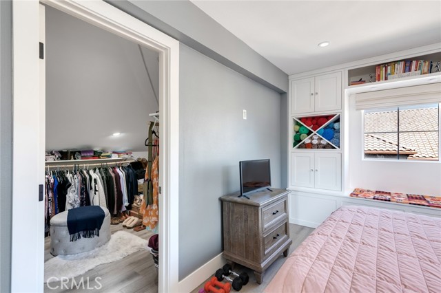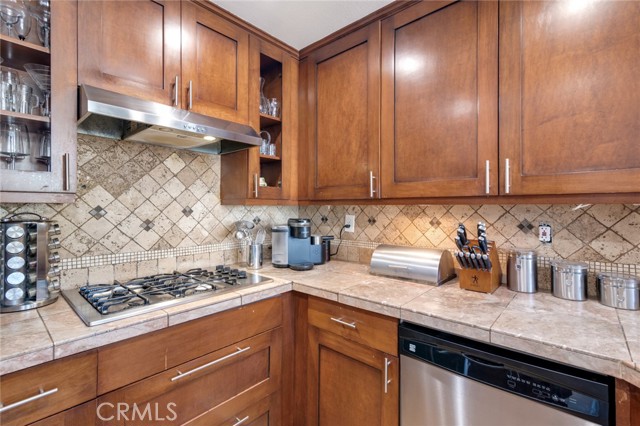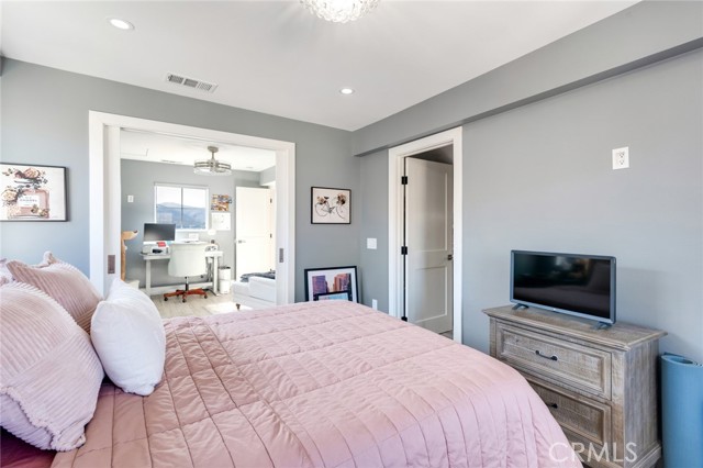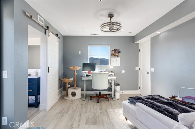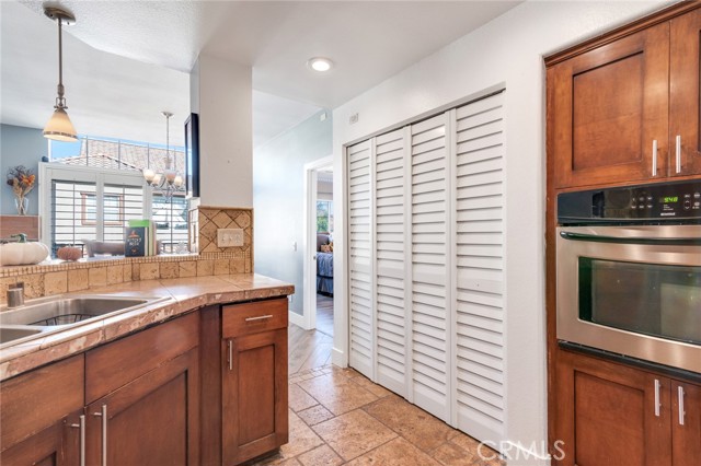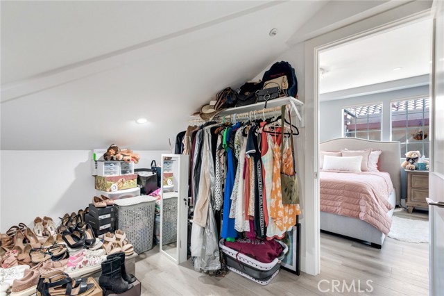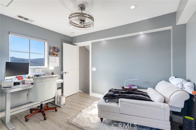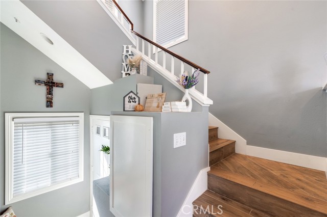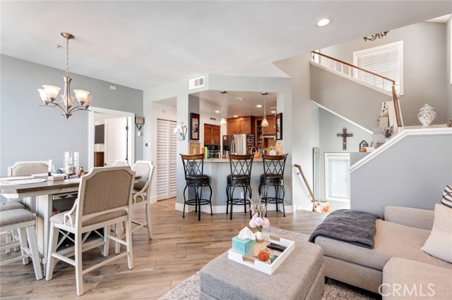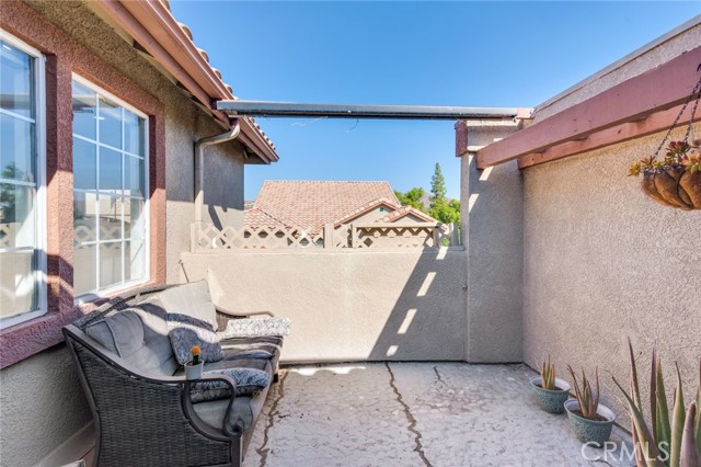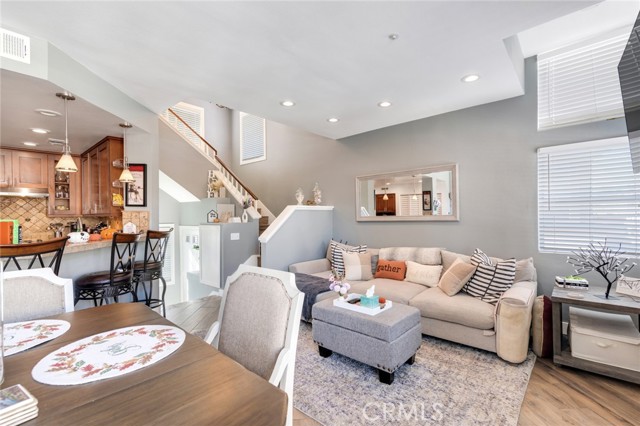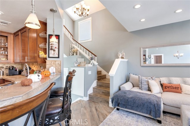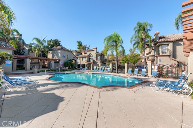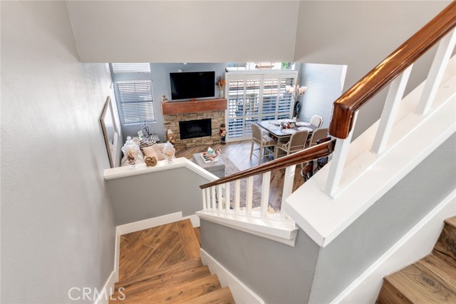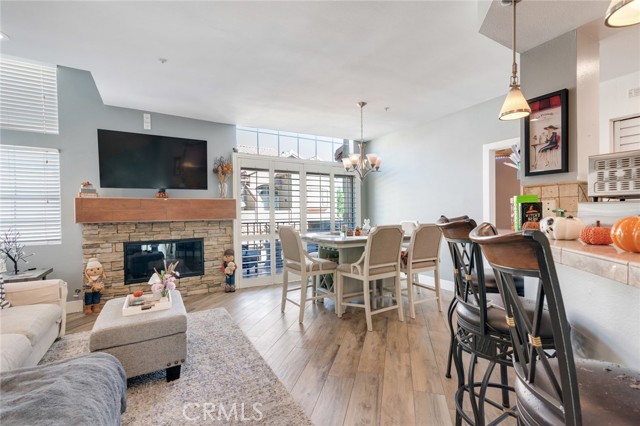 Welcome to this beautiful corner-unit condominium in the highly desirable Villaggio community. This two-bedroom home offers a spacious and open floor plan with custom flooring throughout. The inviting living room features a cozy fireplace and flows seamlessly into the dining area and kitchen, where you'll find custom cabinetry, sleek marble countertops, and stainless steel appliances. The dining area opens to a balcony, perfect for morning coffee or evening relaxation. The main floor bedroom boasts a walk-in closet and an upgraded bathroom complete with dual sinks and travertine flooring. A convenient laundry closet with built-in cabinets is also located on the main level. Upstairs, you'll find a spacious loft-style room currently being used as an office, along with a secondary bedroom featuring a charming pocket door entry, walk-in closet, and a beautiful built-in storage area with a window seat. Motorized blinds and second private balcony enhance the upstairs living spaces, while the upgraded bathroom offers a barn door entry and custom walk-in shower. Additional highlights include a one-car garage directly below the unit, community amenities such as a sparking pool, spa and beautifully maintained landscaping. Ideally located near shopping, dining, and with easy access to the 91 and 15 freeways, this home offers both comfort and convenience.