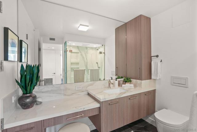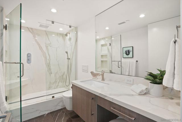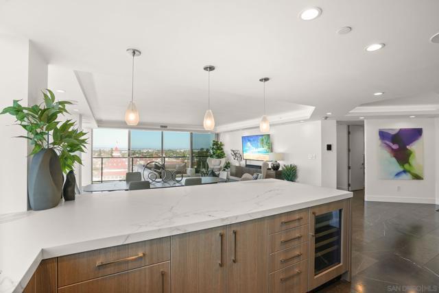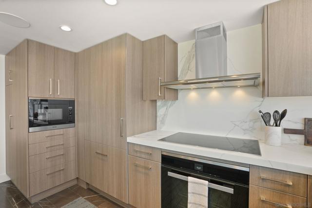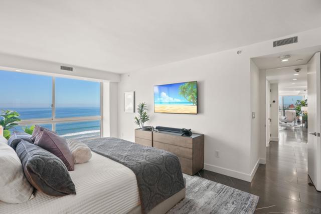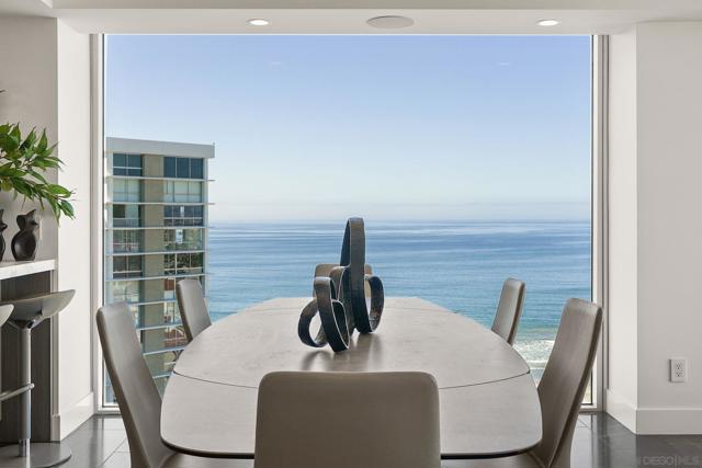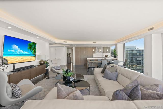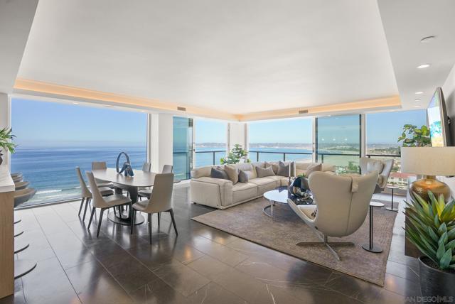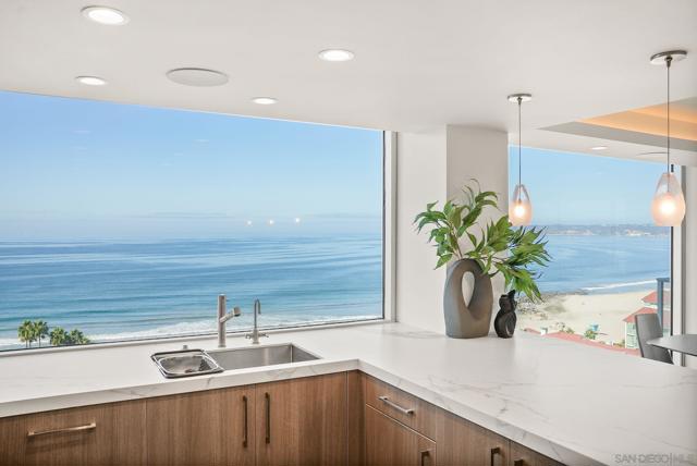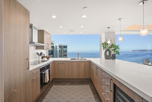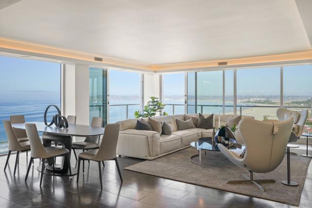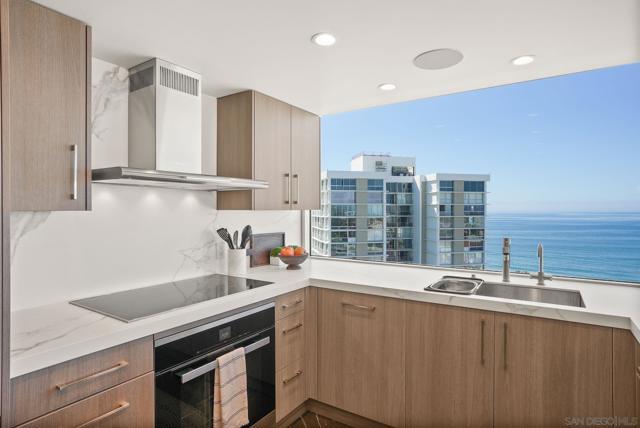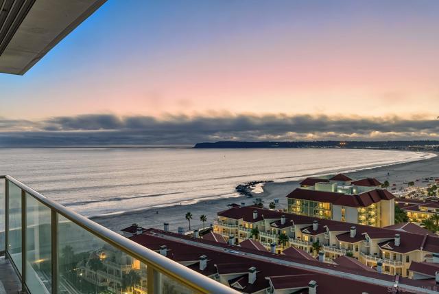 Rising high above the coastline on the 14th floor, this rare 3-bedroom, 3-bath Coronado Shores oceanfront residence embodies the pinnacle of sophisticated coastal living. A custom large-format picture window serves as the home’s centerpiece, framing sweeping unobstructed views of the Pacific Ocean, Point Loma, and the iconic Hotel Del Coronado. Inside the residence is a showcase of refined design, featuring dramatic Black Marquita marble tile floors, sleek Neolith porcelain countertops, and European laminate cabinetry with precision-engineered Legrabox drawers by Blum. The chef’s kitchen is equipped with premium Miele appliances, while a custom integrated sound system provides the perfect backdrop for both elegant entertaining and serene daily living. Beyond the residence, the Coronado Shores offers an exclusive lifestyle with oceanfront pools, tennis courts, pickleball courts, a private clubhouse, and 24-hour security, all just steps from Coronado’s world-renowned beaches, fine dining, boutique shopping, and legendary Hotel Del Coronado. Blending timeless elegance, modern luxury, and a premier oceanfront address, this extraordinary property is designed for those seeking a one-of-a-kind coastal retreat. Schedule your private viewing today and experience the height of ocean-front Coronado living.