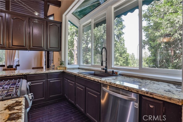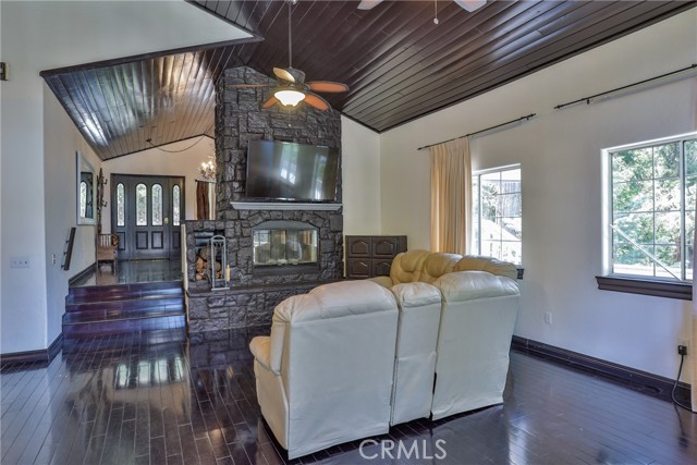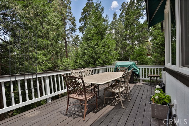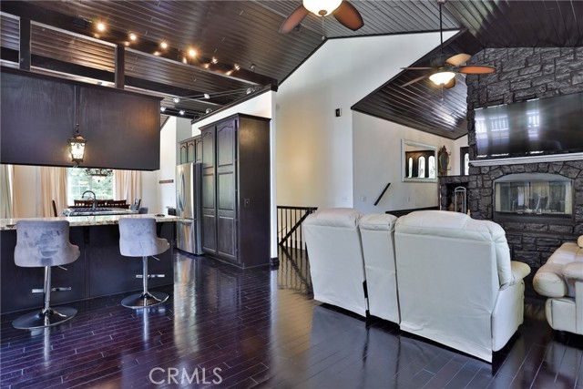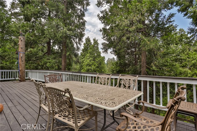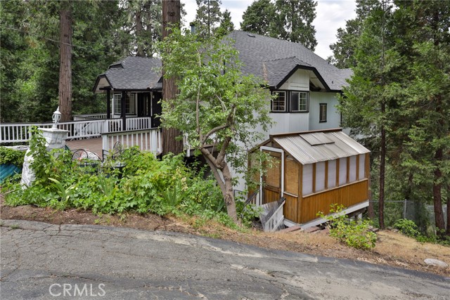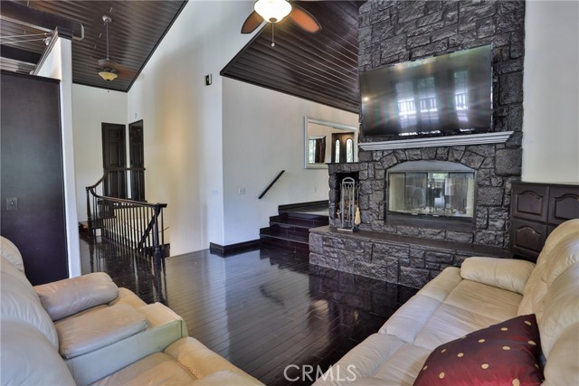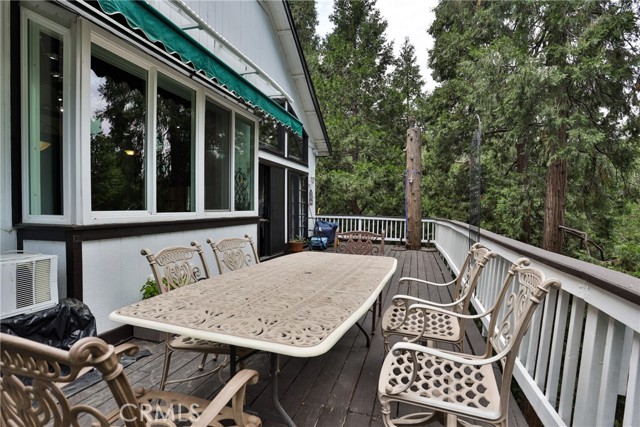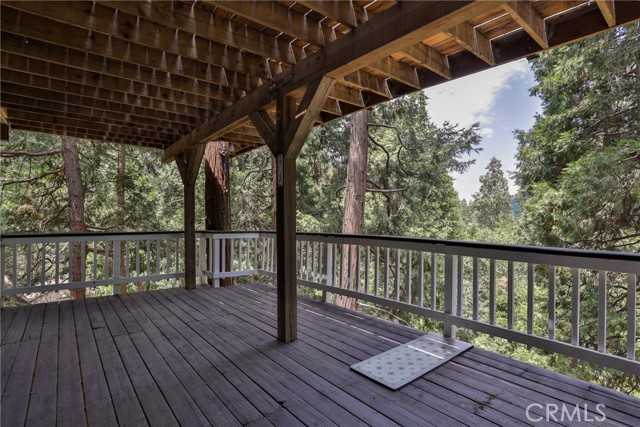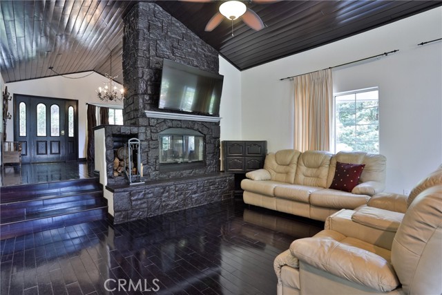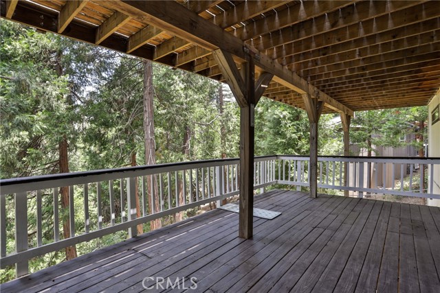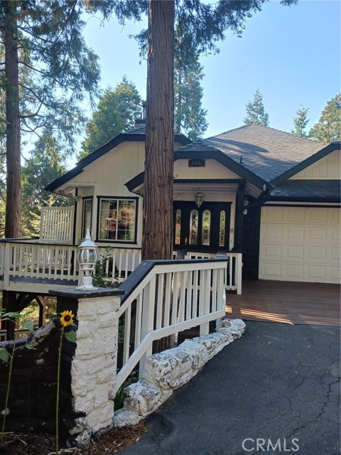 Welcome to your latest opportunity to own a piece of the mountain. There are many pluses here including but not limited to a two car garage with direct access to the inside of the house. The parking area in front of the garage is ample room for two additional vehicles. Entry into the house is through a sweet front porch which leads to glass paneled front door. No steps involved here, just level entry. Walking through the front door you are greeted with a large living room with hardwood floors, vaulted ceilings with half logs for the cabin/mountain feel. Several large windows allow in plenty of light. The stone fireplace is double sided. Take a few steps from the living room and enter the large family room with same flooring and ceiling. The double sided fireplace is here as well with large hearth. Very high ceiling would allow for a beautiful show-stopping Christmas tree. The sliding glass doors lead out to a large deck, great entertaining and barbecues with the natural gas barbecue. Entering the kitchen you will see the beautiful large granite counters and a breakfast/eating counter. A wall of windows above the sink give you lots of light and beautiful view to the trees. On the island is a hammered copper prep sink next to the large stove with oven. The wall affords a large pantry area next to the large refrigerator. A large dining table at the end of the kitchen provides plenty of seating for your meals. A couple steps up from the kitchen there is a half bath to your left and the door leading directly into the garage. This is a dream garage with loads of cupboards for storage and overhead storage as well. The second level has two bedrooms with a Jack and Jill full bathroom with hammered copper double sinks with tub and shower. Lots of closet storage in both bedrooms. The primary bedroom is very large and has direct access onto its own large deck, also lots of large windows and tall ceilings with ceiling fan. Walking into the bathroom you view a large jetted tub, large walk in shower with glass doors and large counter with double sinks. There is an ample sized walk in closet for all your personal items. The 3rd level has a living room, kitchen area, bedroom with double closets and bathroom. There is also a washer/dryer combo unit. The entire top two levels have been freshly painted. Worth your time to check this out.
