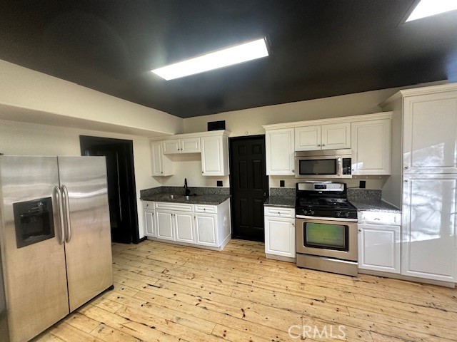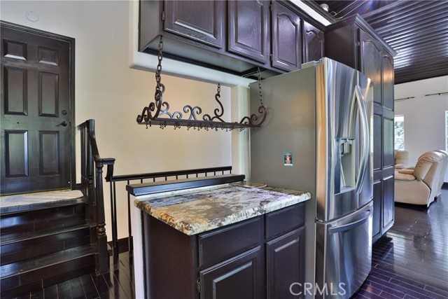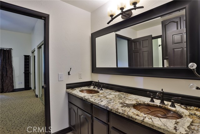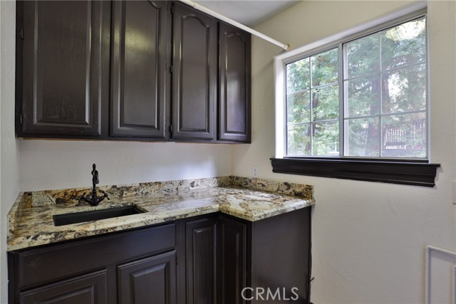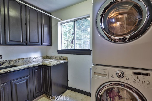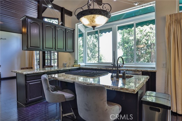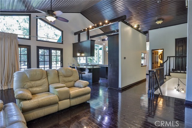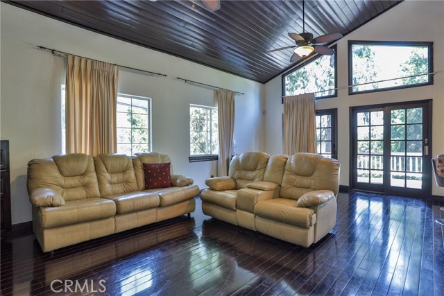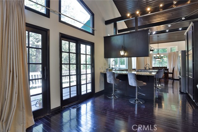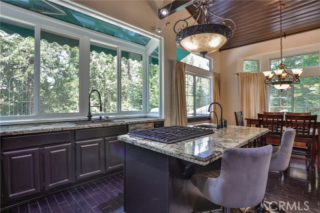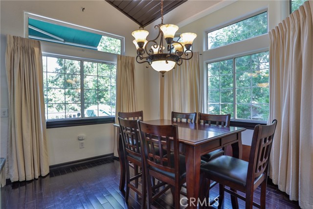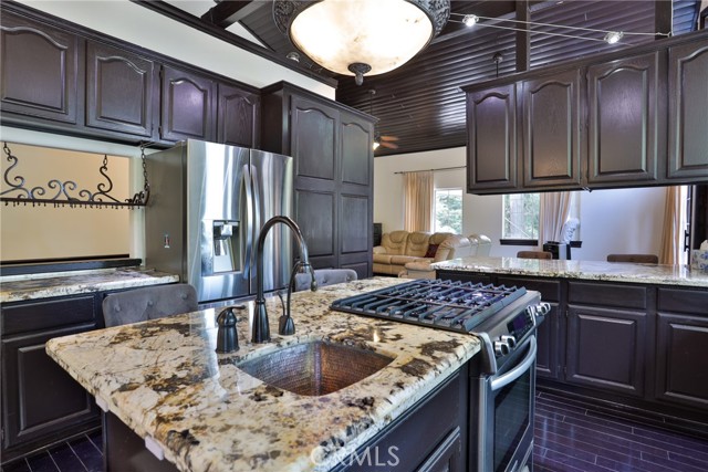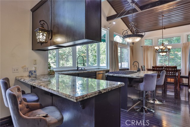 Welcome to your latest opportunity to own a piece of the mountain. There are many pluses here including but not limited to a two car garage with direct access to the inside of the house. The parking area in front of the garage is ample room for two additional vehicles. Entry into the house is through a sweet front porch which leads to glass paneled front door. No steps involved here, just level entry. Walking through the front door you are greeted with a large living room with hardwood floors, vaulted ceilings with half logs for the cabin/mountain feel. Several large windows allow in plenty of light. The stone fireplace is double sided. Take a few steps from the living room and enter the large family room with same flooring and ceiling. The double sided fireplace is here as well with large hearth. Very high ceiling would allow for a beautiful show-stopping Christmas tree. The sliding glass doors lead out to a large deck, great entertaining and barbecues with the natural gas barbecue. Entering the kitchen you will see the beautiful large granite counters and a breakfast/eating counter. A wall of windows above the sink give you lots of light and beautiful view to the trees. On the island is a hammered copper prep sink next to the large stove with oven. The wall affords a large pantry area next to the large refrigerator. A large dining table at the end of the kitchen provides plenty of seating for your meals. A couple steps up from the kitchen there is a half bath to your left and the door leading directly into the garage. This is a dream garage with loads of cupboards for storage and overhead storage as well. The second level has two bedrooms with a Jack and Jill full bathroom with hammered copper double sinks with tub and shower. Lots of closet storage in both bedrooms. The primary bedroom is very large and has direct access onto its own large deck, also lots of large windows and tall ceilings with ceiling fan. Walking into the bathroom you view a large jetted tub, large walk in shower with glass doors and large counter with double sinks. There is an ample sized walk in closet for all your personal items. The 3rd level has a living room, kitchen area, bedroom with double closets and bathroom. There is also a washer/dryer combo unit. The entire top two levels have been freshly painted. Worth your time to check this out.