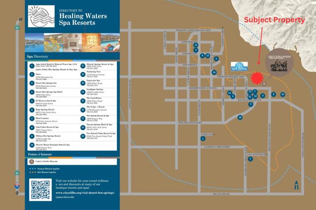 Incredible 10-Acre Opportunity in the (VS-C) Visitor Serving Commercial Zone & Hot Water Spa Zone of Desert Hot Springs - Known as ''Eagle's Nest''Rare opportunity to own two side-by-side parcels totaling 10 acres, perched high above the city with breathtaking panoramic views of the Coachella Valley and surrounding mountains. Located within Desert Hot Springs' highly sought-after Hot Water Zone, this property sits atop a known geothermal aquifer--ideal for future development of a boutique hotel, spa retreat, or wellness resort with access to natural mineral hot springs.Historically known as the ''Eagle's Nest,'' this site was once part of Cabot Yerxa's original homestead and carries a unique heritage that adds value and distinction. The elevated position offers privacy, serenity, and unmatched sunrise/sunset vistas. Just short drive from downtown Desert Hot Springs and another quick trip to enjoy Palm Springs.Zoning and utilities to be verified by buyer. Exceptional investment or development potential in a growing wellness and resort destination.