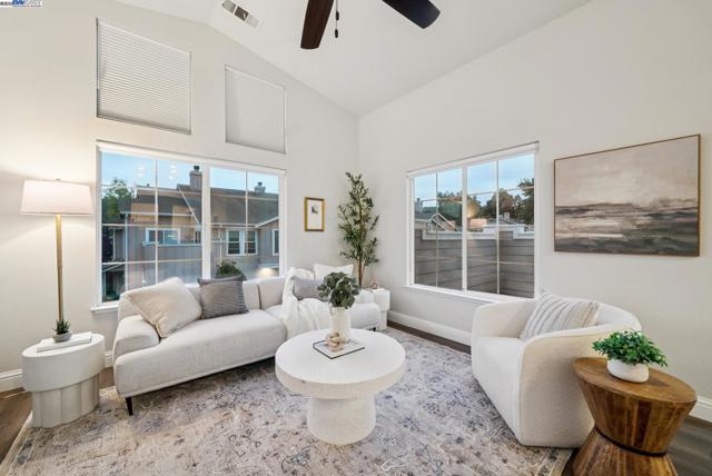 Within the hills of Donlan Canyon is 7387 Dalmally Lane, a corner unit townhouse style condo-home in the California Highlands Community that is not to be missed. This airy and bright end unit townhouse style condo boasts high ceilings, large windows, vinyl plank flooring, functional open concept layout and an attached one car garage. Be a part of any conversation with direct views from the kitchen into the dining room and living room while preparing or hosting daily meals on the quartz countertops and new stainless steel range. The private wing of the home includes a primary bedroom suite with an attached bathroom with plenty of storage and a second bedroom and hall bathroom. Enjoy the views of Donlan Canyon and relax on the private enclosed deck right off the dining room during twilight hours to end your evenings. An exceptional perk is an additional assigned parking space just steps of the front door. Amenities in the community include a pool, an additional deed space just steps from the front door, hiking trails, parks, and highly rated Dublin schools. This home is the perfect blend of serenity and accessibility. BART, freeway access, dining and shopping minutes away.