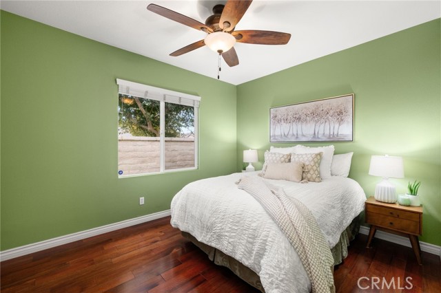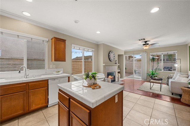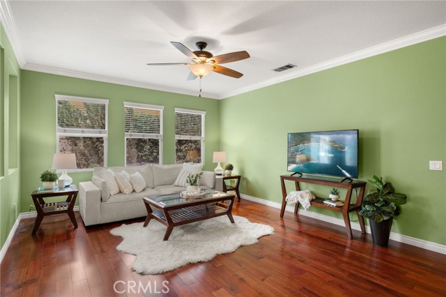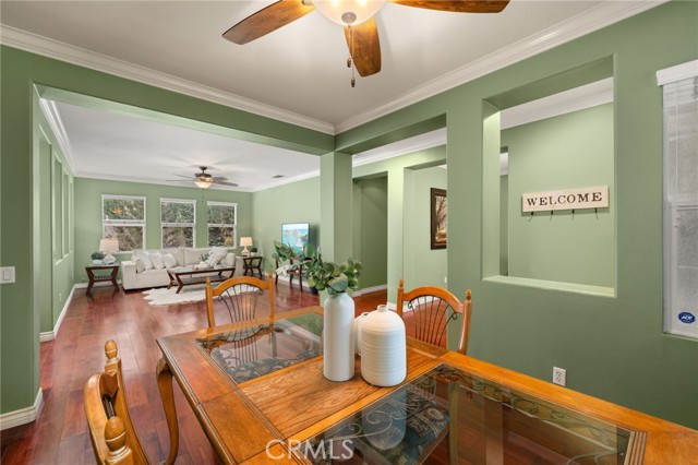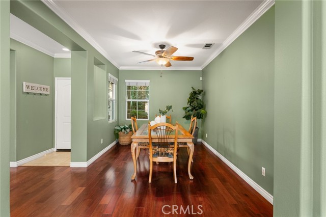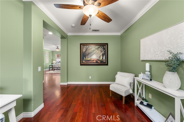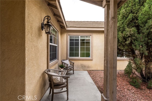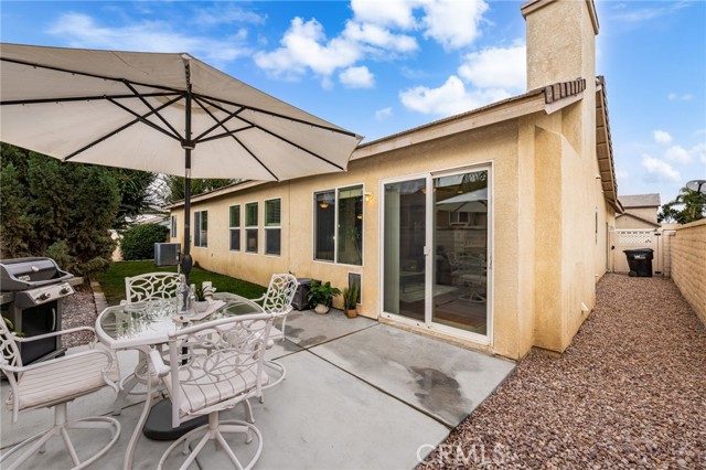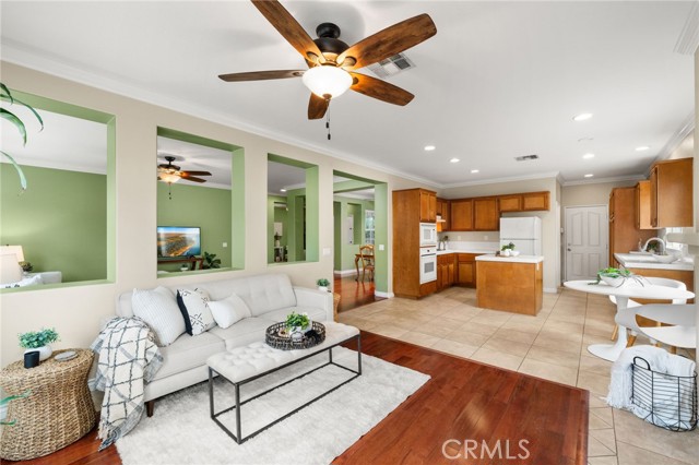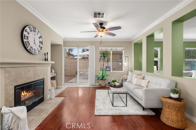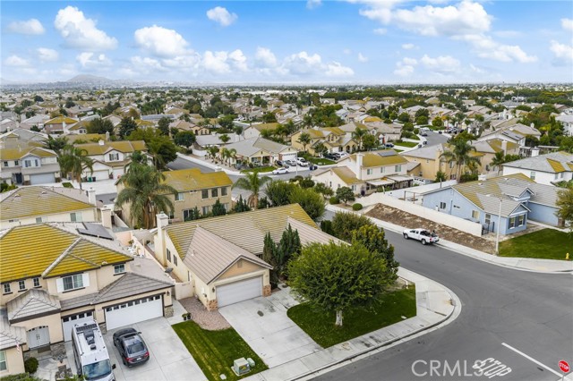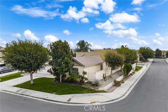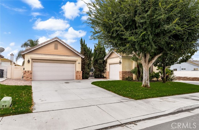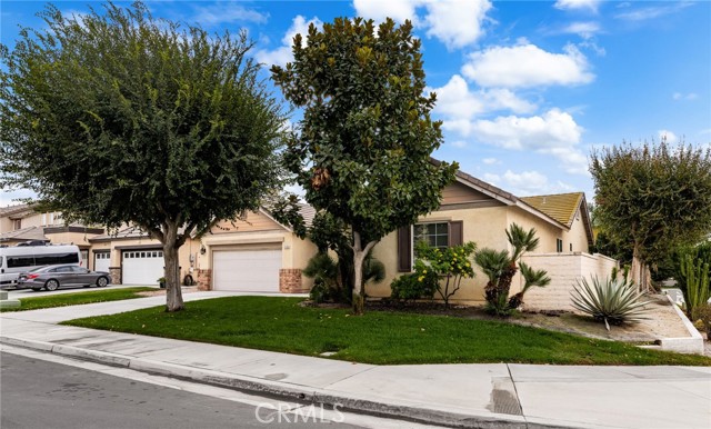 True pride of ownership 3-bedroom, 2-bath single level home with a dedicated office and an inviting front porch, built in 2004 and located on a large corner lot. Home boasts an inviting open floor plan, perfect for entertaining. The bright kitchen features an island, an eat-in dining area and a number of cabinets for ample storage and seamlessly flows into the family room, featuring a fireplace and a slider that opens to a cozy patio and private backyard. The spacious living room is enhanced by stylish cutouts that provide a view into the family room, creating a bright and connected atmosphere. The Formal Dining Room is located just off the living room with a window that looks out to the front patio. The Office is conveniently located just off entry and allows for quiet productivity away from the main living space with the potential to be converted into a fourth bedroom. Retreat to the luxurious master bedroom suite, complete with a spa-inspired bathroom featuring a walk-in shower, a relaxing soaker bathtub, dual vanity sinks, a private toilet room and a generously sized walk-in closet. The hallway bathroom also includes dual vanity sinks with bathtub shower combination. There are two other nice size bedrooms down the hall from the master bedroom, one with a window looking out to the front yard. Features include beautiful hardwood floors throughout most of the home, recessed lighting, ceiling fans, dual pane windows and a separate laundry room (included are newer front-loader washer and dryer). The private backyard is designed for ease, with an outdoor patio that is ready for entertaining and requires minimal upkeep. The property includes a two-car garage at the front and an additional one-car garage at the side providing ample parking and storage. Convenient location, in close proximity to shopping, restaurants and freeways(15, 60 & 91)