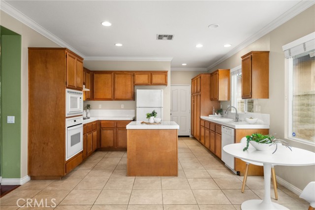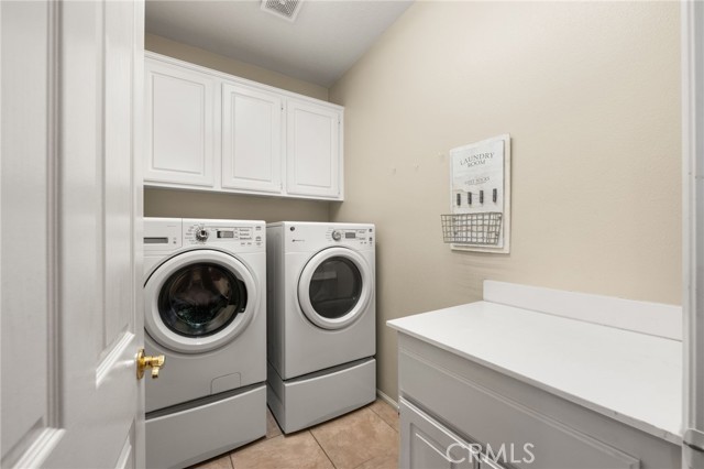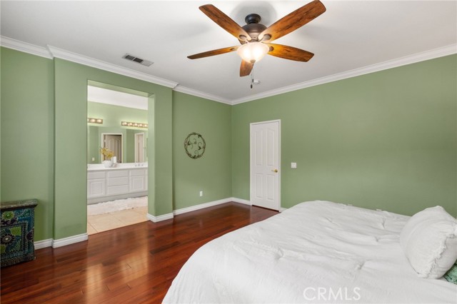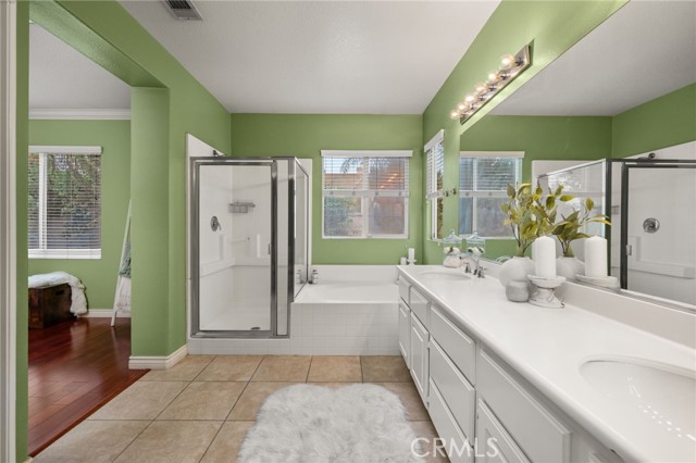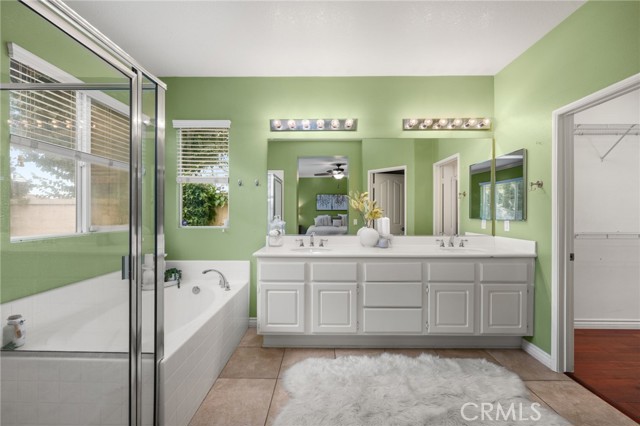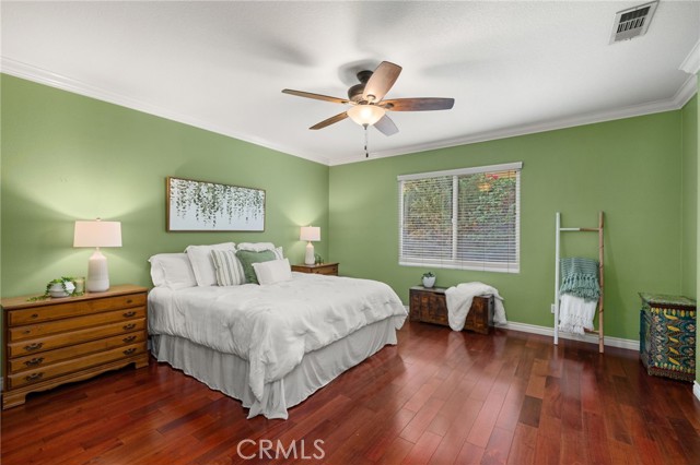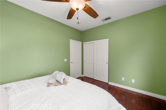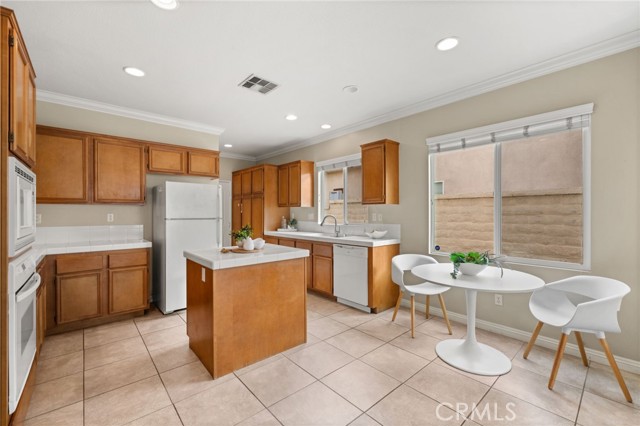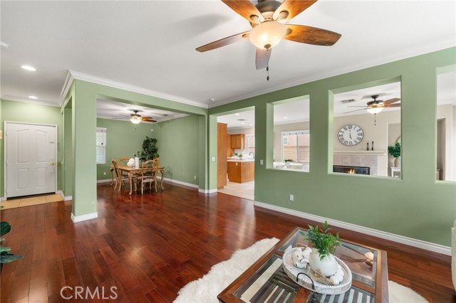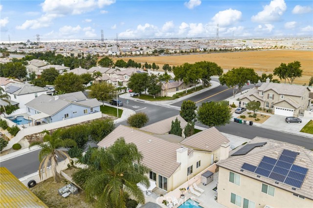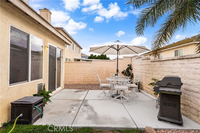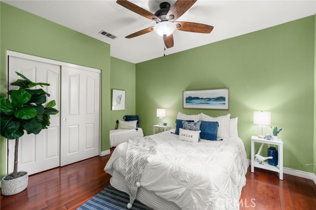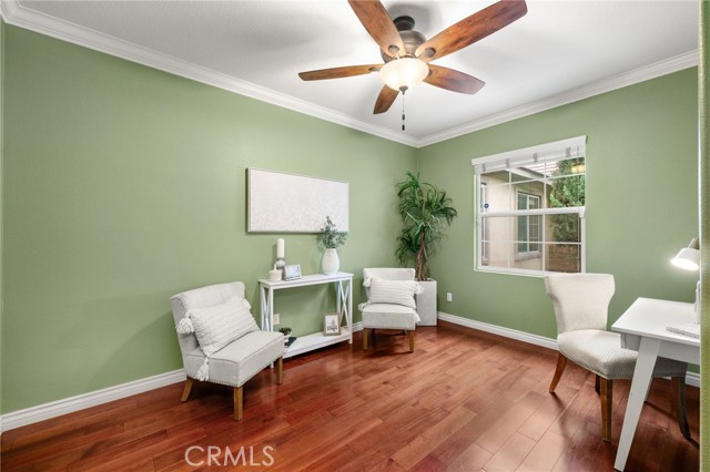 True pride of ownership 3-bedroom, 2-bath single level home with a dedicated office and an inviting front porch, built in 2004 and located on a large corner lot. Home boasts an inviting open floor plan, perfect for entertaining. The bright kitchen features an island, an eat-in dining area and a number of cabinets for ample storage and seamlessly flows into the family room, featuring a fireplace and a slider that opens to a cozy patio and private backyard. The spacious living room is enhanced by stylish cutouts that provide a view into the family room, creating a bright and connected atmosphere. The Formal Dining Room is located just off the living room with a window that looks out to the front patio. The Office is conveniently located just off entry and allows for quiet productivity away from the main living space with the potential to be converted into a fourth bedroom. Retreat to the luxurious master bedroom suite, complete with a spa-inspired bathroom featuring a walk-in shower, a relaxing soaker bathtub, dual vanity sinks, a private toilet room and a generously sized walk-in closet. The hallway bathroom also includes dual vanity sinks with bathtub shower combination. There are two other nice size bedrooms down the hall from the master bedroom, one with a window looking out to the front yard. Features include beautiful hardwood floors throughout most of the home, recessed lighting, ceiling fans, dual pane windows and a separate laundry room (included are newer front-loader washer and dryer). The private backyard is designed for ease, with an outdoor patio that is ready for entertaining and requires minimal upkeep. The property includes a two-car garage at the front and an additional one-car garage at the side providing ample parking and storage. Convenient location, in close proximity to shopping, restaurants and freeways(15, 60 & 91)