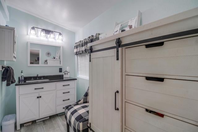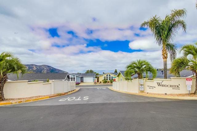 Welcome to this charming Woodcreek Estates (all ages park) 3-bedroom, 2-bathroom home located on a corner lot with a permanent foundation. All under vaulted ceilings, enjoy hard surface flooring in the living spaces and primary bedroom and plush carpet in the auxiliary bedrooms, a thoughtfully redesigned kitchen including ample cabinetry, beautiful granite countertops, stainless steel appliances with a double oven and corner breakfast nook. A walk-in pantry was added for additional storage. The spacious dining and living room combo bask in natural light. Both bathrooms have been remodeled with tasteful fixtures. Additional features include an interior laundry room, enlarged (by 4 feet) garage with storage cabinets, shelving and direct access to the home plus a 3-year new HVAC system + energy efficient ducting. The spacious backyard is fully fenced and features a large aluminum patio cover with fan/light to enjoy meals al fresco. The park features ample guest parking, a community room with remodeled kitchen and separate billiard room, pool, spa, gym and RV/Boat storage (extra nominal fee). All appliances, televisions, and tv mounts convey.