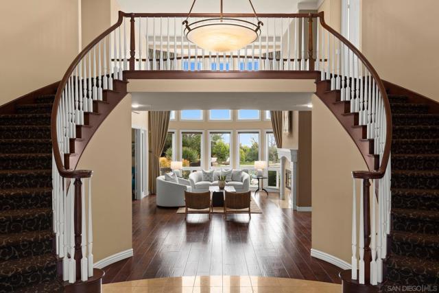 Stunning and serene, this lush two-acre estate is nestled at the end of a private cul-de-sac in Knightsbridge Country Estates, one of Olivenhain’s most prestigious gated communities. With sweeping southwest views, this 5,500 sq ft sanctuary blends classic architecture, luxury finishes, and flexible living areas designed for both entertaining and everyday comfort. This home embodies quiet luxury with timeless materials, refined design, and purposeful spaces that balance elegance with comfort, creating a tranquil retreat rooted in authenticity. (see supp) A dramatic dual staircase entry sets the tone for the interiors, opening into a soaring, light-filled living room framed by expansive windows that highlight the home’s southern exposure and unobstructed views. The main level includes a guest bedroom with private entrance and full bath, ideal for multigenerational living or a home office, along with formal living and dining areas, a family room, and a custom wine room. The gourmet kitchen features stainless steel appliances, a large center island, and a butler’s pantry, flowing seamlessly into the family room and outdoor BBQ area. Upstairs, the primary suite boasts a private balcony, walk-in closet, and a luxurious dual-sided bath. Three additional bedrooms and a flexible bonus room complete the upper level. Resort-style amenities include a sparkling pool, two detached studio/gym structures, an oversized four-car garage, owned solar, and full city services (sewer, water, streets)