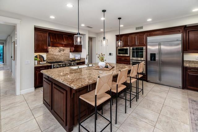 The perfect family retreat less than a mile from the beach, this residence combines spacious design with a lush, tropical atmosphere. Ideally situated along the coast and within walking distance of shops, dining, and hiking trails, the 5-bedroom home rests on a 0.36-acre corner lot with a sparkling pool and no neighbor on one side. Inside, soaring ceilings highlight a thoughtful floor plan that includes a main-level suite with a full bath and private outdoor access. The chef’s kitchen is equipped with GE appliances, dual convection ovens, a griddle, warming drawer, pot filler, and hidden spice racks built seamlessly into the decorative range columns. A nearby powder bath for guests and a spacious laundry room add convenience. All five bedrooms feature en-suite baths with tiled tub surrounds, walk-in closets, and timeless plantation shutters. The primary suite serves as a private sanctuary, complete with dual walk-in closets and a serene, restful ambiance. Designed for effortless indoor-outdoor living, the home offers multiple patios and a covered courtyard with a fireplace—recently enclosed for enhanced privacy. The resort-style backyard boasts turf, vibrant landscaping, a soothing fountain, and a sparkling pool and spa, creating the perfect setting for entertaining or relaxing under the sun. Bonuses include owned Tesla solar and a powerwall back up battery. Close to the San Diego Botanic Garden, Encinitas Ranch Golf Course, the Coastal Rail Trail, Moonlight Beach, and more—this home truly has it all. Welcome home.