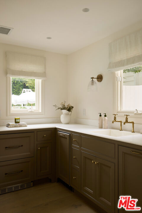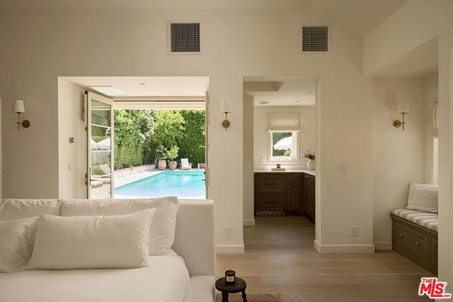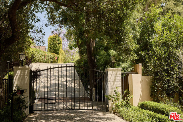 Tucked discreetly behind a wrought-iron gate and up a long, picturesque driveway that crosses a charming bridge, this beautifully reimagined ranch-style retreat offers a rare blend of privacy and allure. Sheltered beneath a canopy of oak trees and framed by vibrant rose gardens, the home exudes warmth and sophistication. Meticulously remodeled with high-end finishes and an exceptional eye for detail by interior designer Paula Bruss, the single-story residence is filled with natural light, thanks to expansive windows that capture the sun from dawn to dusk. Vaulted ceilings, refined stone and tile work, designer fixtures, and architectural character elevate every room with timeless charm. French doors open to an enchanting backyard oasis, with a spectacularly oversized swimming pool and lush green lawn perfect for relaxing, entertaining, or simply enjoying the serenity of nature. The long paver-stone driveway leads to a spacious motor court with ample parking, in addition to a two-car attached garage. A separate, private guest house complete with a full bathroom and kitchenette offers ideal accommodations for guests, extended family, or a home office. The main residence includes three bedrooms (one of which is currently converted into a custom closet but can be easily reverted), spanning approximately 3,770 sq ft. The guest house adds an additional approximate 400 sq ft of well-appointed living space.