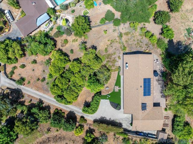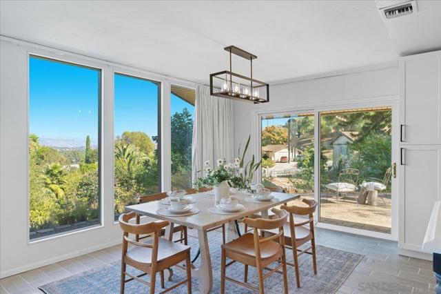 This single-level ranch-style home is situated on a fenced three-quarter acre lot with mature landscaping and a gated entry accessed by a private driveway. The property includes an established orchard and garden beds. The interior features a remodeled kitchen with concrete countertops, stainless steel appliances, white cabinetry, and floor-to-ceiling windows that bring in natural light and capture mountain views. The open layout connects the living and dining areas, and the living room includes a fireplace with a sitting area located off the kitchen. Sliding glass doors lead to a large patio with pavers and outdoor lighting. The home offers four bedrooms and two remodeled bathrooms, with one bedroom suitable for office or flex use, and an indoor laundry room conveniently located near the bedrooms. Additional features include central air conditioning, a leased solar system at approximately $100 per month, and an oversized garage with space for workshop use. Located in South Escondido, this property offers convenient access to shopping, dining, schools, parks, and major freeways, making it an excellent location for both commuting and enjoying local amenities.