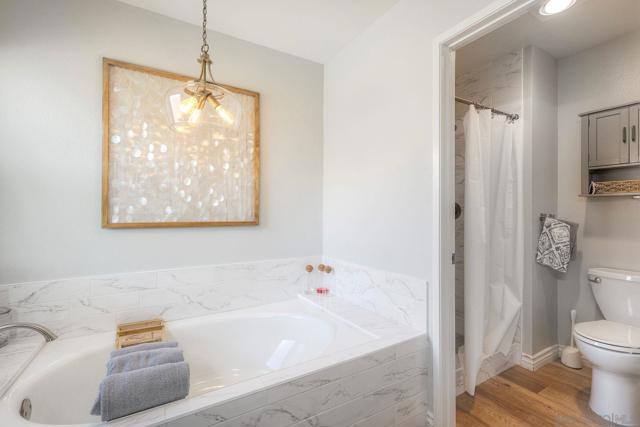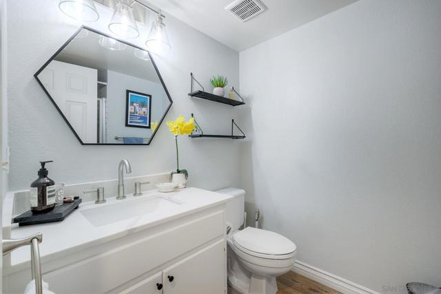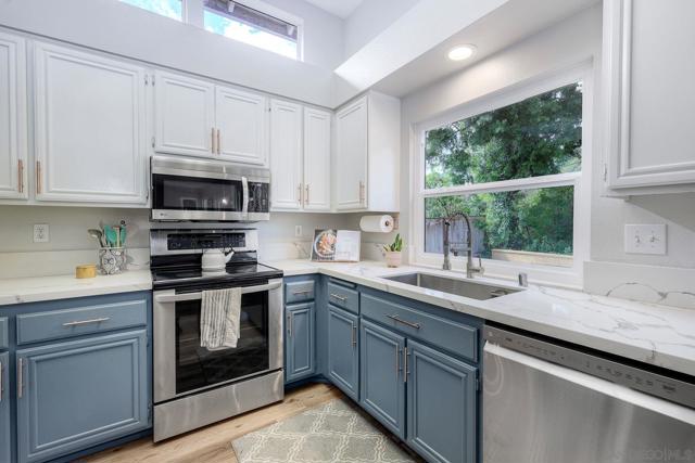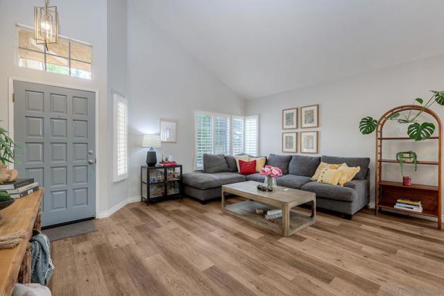 Near Lake Hodges this 4 bed/3 bath Summercreek home offers 2,324 square feet of well designed living space. As you enter, you’ll be impressed by the open, airy living/dining room with vaulted ceilings, plantation shutters, and dramatic staircase with a skylight above that provides an abundance of natural light. The kitchen boasts high ceilings with windows above the cabinets that brighten the space. A deep single basin sink overlooks the peaceful backyard, while the adjacent breakfast nook, framed by bay windows, offers a lovely spot to enjoy your morning coffee. The spacious family room, complete with a cozy fireplace, is perfect for gatherings. A sliding door to the backyard ensures this space is filled with light, making it an ideal spot for family gatherings or quiet evenings at home. Conveniently located on the main floor is 1 bedroom and a full bath, providing versatile options for a guest room, office, or multi-generational living space. Upstairs, the primary suite features vaulted ceilings and multiple windows. The ensuite bathroom includes a double sink vanity, soaking tub, and separate shower. Two additional bedrooms with ceiling fans and a full bathroom with a tub/shower combo complete the upper level. Additional highlights of this home include a 2-car garage, newer AC and furnace, a newer roof, updated windows, and an upgraded electrical panel. With its flexible floor plan, ample natural light, and prime location near Lake Hodges trails and shopping, this home is a true gem. Don’t miss your chance to make it yours!