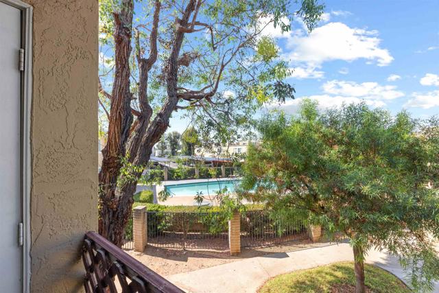 This spacious two bedroom, one bath, second floor end unit features vaulted ceilings in the living room, a large primary bedroom, and plenty of natural sunlight. Two designated parking spaces are assigned to the home. A view of the pool, you can enjoy outdoor entertainment or dining on the private balcony. The gated complex offers two pools and is located in the heart of Escondido. Close to shops, restaurants, conveniently close to the 78. HOA includes: water, electric, sewer, trash, pools, and gated community. Please note: photos are from previous listing, unit currently rented until November. NOT FHA APPROVED COMPLEX