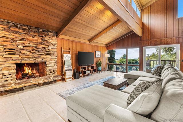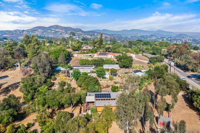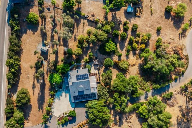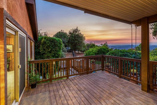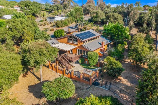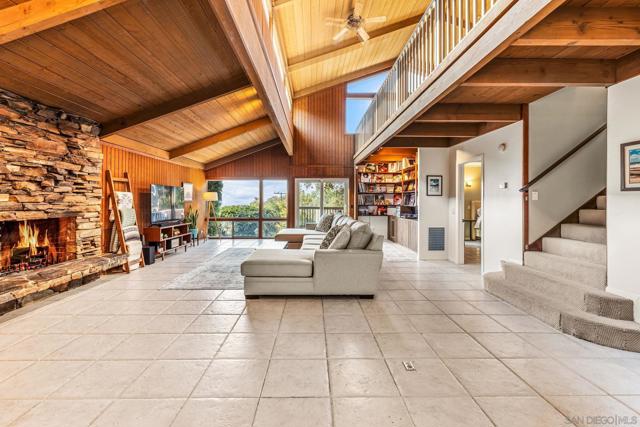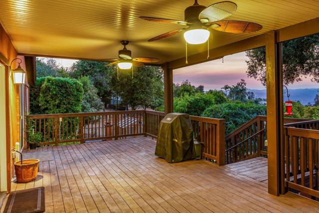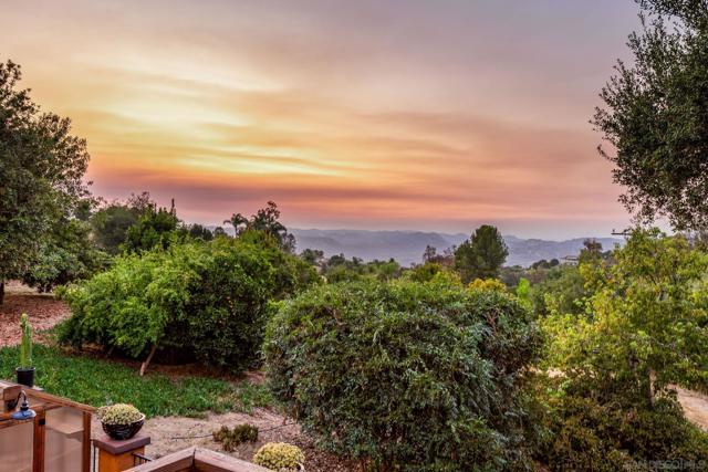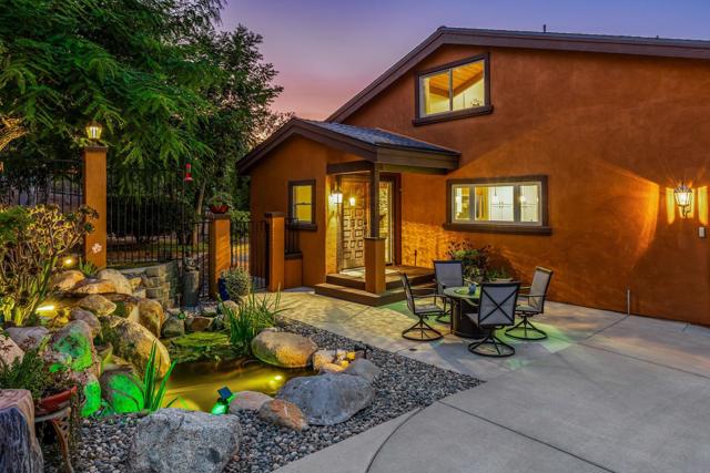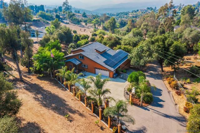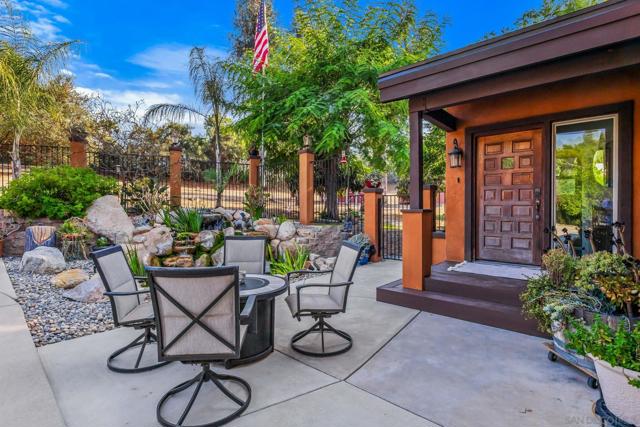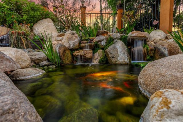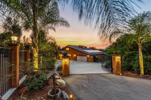 Pristine Fallbrook gated retreat on 1.64 acres, surrounded by lush landscaping and sweeping panoramic views. Beyond the double wrought-iron gates lies an exquisite custom home that seamlessly blends energy efficiency with extensive, tasteful renovations; crafted for both comfort and entertaining. While conveniently located near main thoroughfares, the home and grounds remain exceptionally quiet and private. Enhanced insulation and updated windows ensure a serene interior, while the tranquil koi pond at the entry adds to the calming ambiance. The property is adorned with fruit and nut trees including pomegranate, citrus, loquat, kumquat, and macadamia, welcoming you into a lush, garden-like setting. Inside, an open-concept design with vaulted ceilings, natural rock fireplace, warm wood accents, and expansive windows fills the home with light and gives it a cozy vibe. The chef’s kitchen shines with high-end appliances, pendant lighting, and durable composite countertops. The entry-level primary suite opens to a panoramic-view porch, and its spa-inspired bath features dual sinks, a soaking tub, walk-in shower, and rich wood cabinetry. Upstairs, a spacious loft overlooks the living room and offers flexibility as a third bedroom, game room, or secondary living space, alongside a generously sized second bedroom and full bath. Recent upgrades include a new roof, updated windows and insulation, a new heat/AC pump, and an owned 40-panel solar system. With breathtaking vistas of rolling hills, this private and peaceful oasis is truly a must-see!