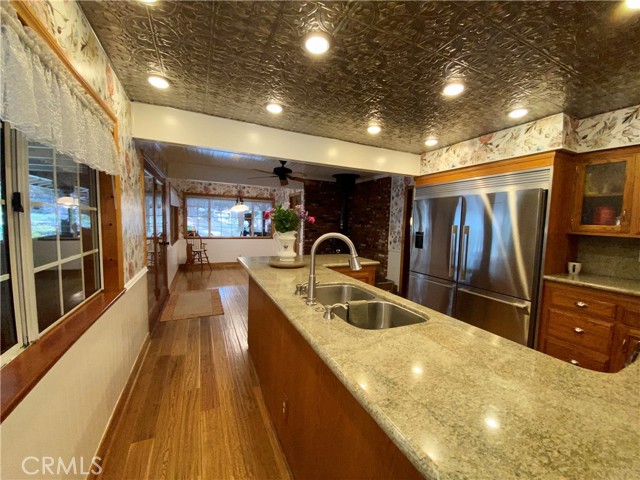 Price Reduction ~~ A True Mountain Beauty. This Rare find on an huge Lot, 12400+ sf, features a 5 car Oversized Garage, 1 for RV & additional RV side parking for any extra toys. Beautiful 5 bedroom 2 bath home set in the serene town of Forest Falls has everything you have dreamed of. Covered wrap around Porch invites you into this Gem with Gorgeous Wood Flooring, Updated kitchen with Stainless Steel appliances featuring double refrigerators, Granite counters, recessed lighting & wood burning stove. The open Living room will shine when your guests gather at the Stone fireplace & wood burning insert. Lower level Primary bedroom with deck & your own Spa, Primary bath with walk in closet, 4 Spacious, carpeted Bedrooms up stairs with full bath & Bonus rooms for kids &/or your Crafting needs. Indoor Laundry area includes the washer/dryer, sink & extra cabinets, Landscaped yard w rock pathways & planters, a garden shed/green house & workshop for the wood worker? Additional shed for lawn/garden equipment. Front facing deck to take in the crisp morning air & Rock water feature with pond. Home is equipped with leased Solar & battery back up and owned Propane tank EV charging outlet in garage & electrical hookups for RV area. Additional parking in front of the home & easy to access the street with circular driveway. Close to Redlands shopping & restaurant area approx 20 mins away & just down the hill from Big Bear. Seller has FEMA letter stating flood ins is not required (recommended) So much to see in this Beauty, Make your appt Today !!
