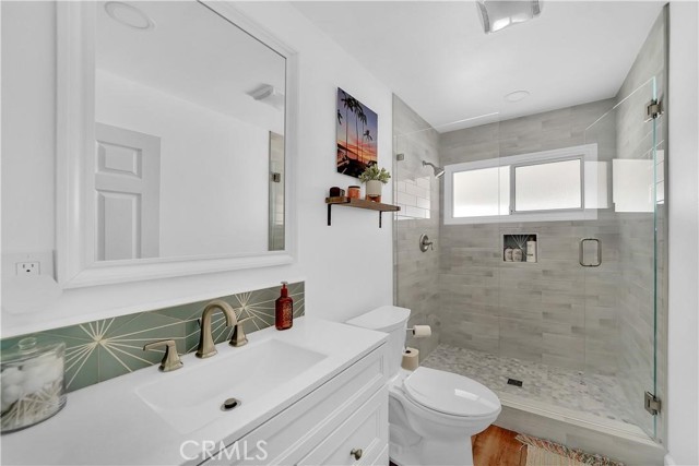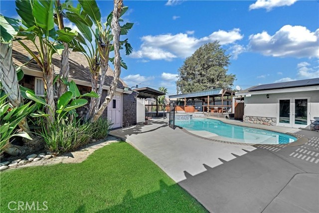 ***LOVELY MOVE-IN Ready Home*** 4 Bedrooms, Expandable to 5, making it suitable for families of various sizes! An added benefit is having ample energy with SOLAR PANELS that are owned and paid off to dramatically REDUCE ELECTRICITY COSTS!!! TWO additional UNITS both with air conditioning and one with bathroom on this property. This IMMACULATE spacious REMODELED SINGLE-STORY residence features luxurious amenities, including recessed lighting throughout the home, an open living and dining room with solid luxury vinyl plank wood flooring in most areas, a fully remodeled interior with ALL three BATHROOMS completely remodeled, and custom cabinets and upgraded countertops, with new hardware and lighting fixtures. The tub and shower areas are adorned with decorative tiles and beautiful backsplash and niches to put amenities. This modern UPGRADED REMODELED KITCHEN is equipped with new Corian countertops, elegant backsplash, stainless steel appliances, custom cabinets, upgraded hardware, a new sink, and fixtures, along with an advanced RO water filtration system. Also, the home has an RO Water Softener system for added convenience, Tankless Water Heater and HVAC Air-Conditioner was put in recent years. You have your own Outdoor Oasis with an attractive pool and spa, it's a great place to relax and enjoy the outdoors. Two of the bedrooms are sizable master suites. The office can be converted back into a bedroom. The family room features high ceilings and ample space. Throughout the house are dual-paned, energy-efficient windows that allow lots of sunshine to filter in. This home has bay windows, French doors, and sliding glass doors. The property is approximately a .26-acre lot, and also offers an ADU-style detached guest house, with a loft, and 3/4 bathroom, an air-conditioner, an outdoor shower to rinse off after swimming in the pool and relaxing in the spa. There is another detached guest room with an air-conditioner, covered patios, and a large deck area for home is perfect for those seeking space and modern comforts." The versatility of this property makes it even more accommodating and desirable. The property includes an attached 2-car garage, an expansive driveway for multiple cars, and unique RV parking for RVs up to 34 feet in length, along with an RV clean-out for waste disposal. Conveniently close to schools, shopping centers, supermarkets, and many varieties of restaurants, and more.
