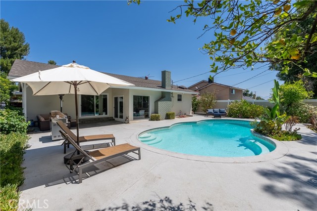 Tastefully remodeled gem in the heart of Granada Hills, this 3-bedroom, 2-bathroom home offers 1,833 sq. ft. of bright, open living space on an inviting 8,510 sq. ft. lot. The modern kitchen showcases sleek cabinetry, updated appliances including a 36-inch 6-burner stove, copper kitchen plumbing, and a seamless flow into sun-filled dining and living areas framed by recently replaced windows. The spacious primary suite features a private en-suite bath, while the additional bedrooms provide comfort and flexibility for family, guests, or a home office. Notable upgrades include a brand-new AC system (2024), new electrical panel, permitted earthquake retrofit, and an automatic sprinkler system for easy maintenance. Step outside to a backyard with a sparkling pool (new pool pump 2024), landscaping, and a covered patio with a BBQ area—perfect for entertaining or unwinding in style. Located within the boundaries of top-rated schools and just minutes from parks, shopping, dining, and easy freeway access to the 118 and 405, this home offers the perfect blend of comfort, style, and convenience.