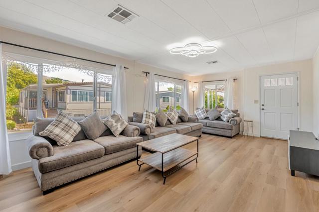Welcome to this inviting home located in the highly sought-after Spanish Ranch II 55+ community. Offering 2 bedrooms and 2 bathrooms, this home features a large living room flows seamlessly into the dining area, featuring laminate flooring and double pane windows that fill the space with natural light. The kitchen is equipped with matching appliances, including a gas cooktop, built-in oven, and refrigerator, making it a great space for both everyday meals and entertaining. The family room, complete with French doors, opens to an expanded covered porch, providing the perfect setting for indoor-outdoor living. Both bedrooms are a great size with closet space and has a private bathroom. A convenient laundry room with hookups and storage adds practicality to daily living. Additional features include A/C; new roof (2023); new master bath; and new shed