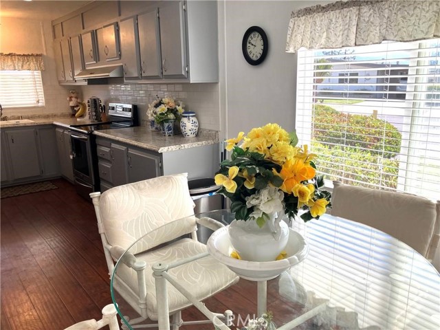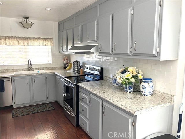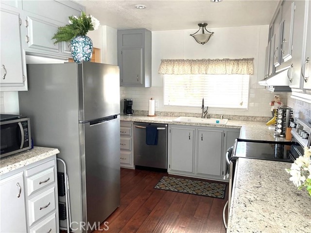 Come see this well maintained triple wide manufactured home on a corner lot in the desired Foothills of Hemet 55+ senior community. This fabulous home has an open floor plan with 1,536 sqft, two bedrooms (both huge) and two full baths, carpet in the bedrooms but the laminate flooring throughout gives this home a very polished look. Updated kitchen with stainless steel appliances & a designer look to it and the cutest little dinette area off the kitchen. Inside laundry with a folding table & storage cabinets. There's a sliding glass door to step out onto the patio which is a great spot for relaxing with your morning coffee or entertaining on those beautiful evenings. Great backyard if you’ve got a dog since many homes here don't have grass but this yard does so your fur babies will love it. Plenty of parking for your guests right next to the home. The park is clean, quiet, gated and just plain awesome with amenities including 2 swimming pools, spa, pickleball courts, air-conditioned shuffle board court, exercise room, recreation hall w/kitchen, and rooms to enjoy billiards, cards & crafts. Commuter friendly, and close to shopping & restaurants.