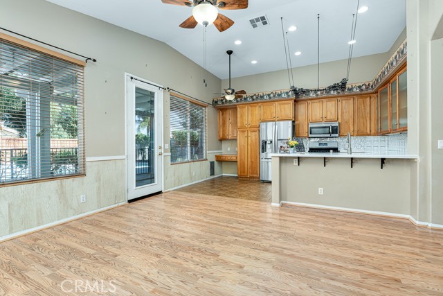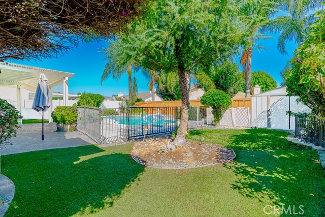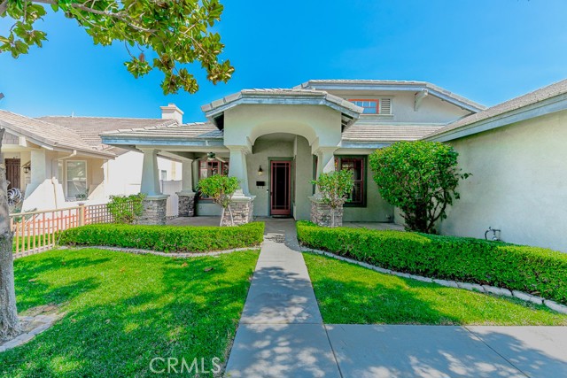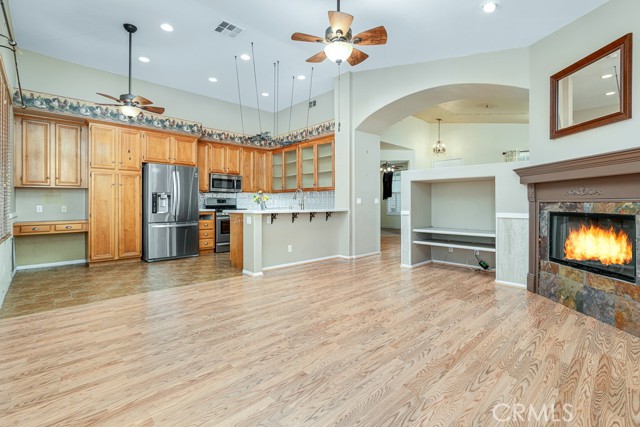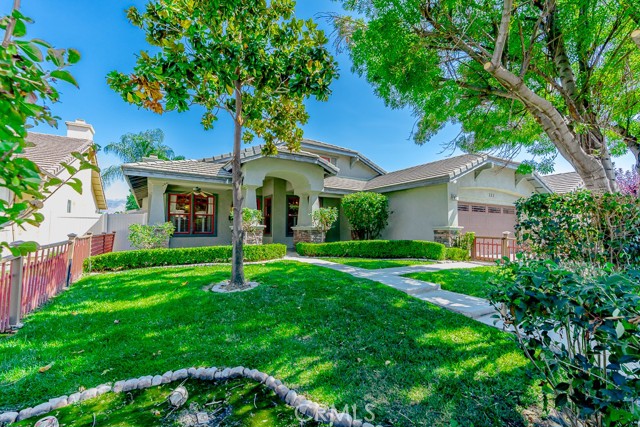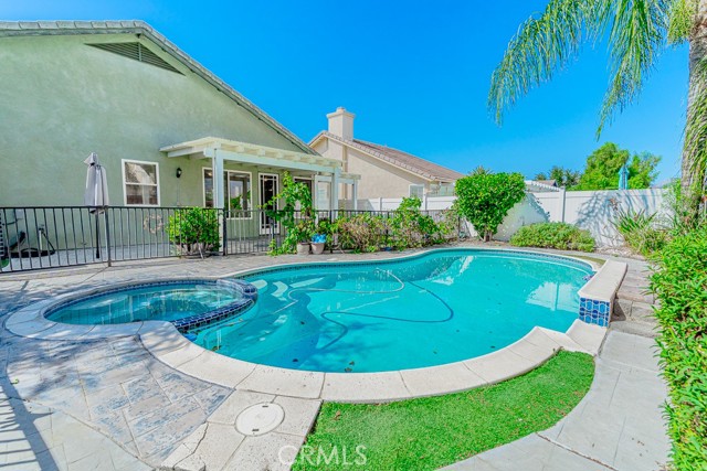 Welcome to this beautifully maintained 3-bedroom + den, 2-bath Craftsman-Style home in the heart of East Hemet. Offering 1,742 sq. ft. of comfortable living space, this property is filled with custom upgrades and thoughtful details throughout. The inviting exterior features a tile roof, stone accents, a spacious covered front porch, and a generous rear patio—perfect for relaxing or entertaining. Step inside to discover upgraded flooring, designer lighting, ceiling fans, and a cozy gas log fireplace with slate surround. The kitchen is a standout, featuring rich wood cabinetry with glass-front accents, granite tile counter-tops, and built-in appliances. Both full bathrooms boast double vanities, with the primary bath showcasing a custom cabinet, a garden tub, and a separate shower. The beautifully landscaped yard is fully fenced front and back, with a separately fenced pool and spa area for added safety. Whether you're hosting gatherings or enjoying a quiet evening at home, this property offers comfort, style, and functionality in one desirable package.
