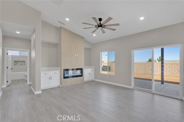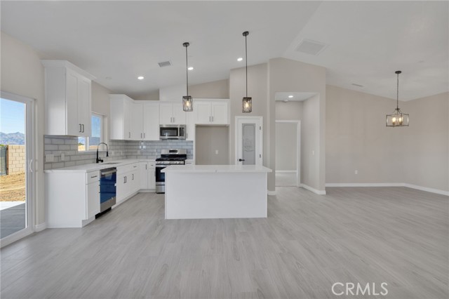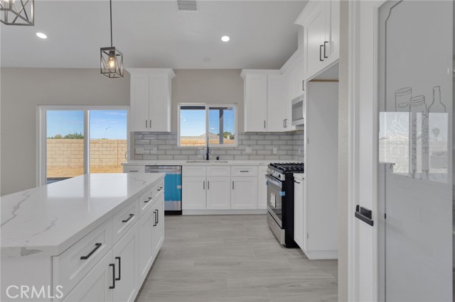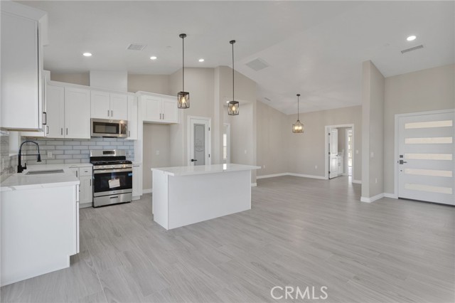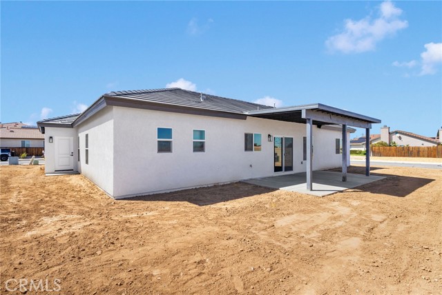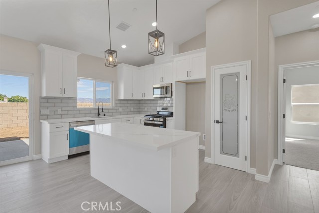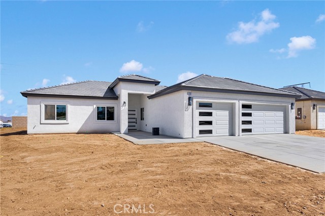 Brand New Construction Home in a very sought out area of Hesperia! Close to all Off Roading fun. ---NO H.O.A...... NO MELLO- ROOS TAXES LIKE ALL THE OTHER NEW COMMUNITIES BEING BUILT!!!!----Featuring paid OFF solar, This home has beautiful style elements with modern designs for unparalleled living which included tiled walls. The living area is flooded by natural light with a beautiful fireplace as the focal point also featuring an open layout design to the kitchen. Step into the modern kitchen with new soft-close cabinetry, Quartz countertops, accented by stunning tile backsplash, stainless steel appliances, a walk-in pantry, and a large center island. High ceilings, stunning ceramic tile flooring flows throughout the home, and so much more! This home boasts 4 beds, 2 bathrooms, 1729 sqft, BIG deep 3 car garage, Split floor-plan, and laundry room. The indoor laundry is equipped with quartz counter and plenty of cabinet space. Indulge in the master suite with an oversized walk-in closet, the master en-suite offers a custom tile walk-in shower, 2 shower heads, and dual sinks. The guest bathroom has been a stand-in shower and tub. Enjoy the backyard, covered patio, and make this BRAND NEW HOME yours!