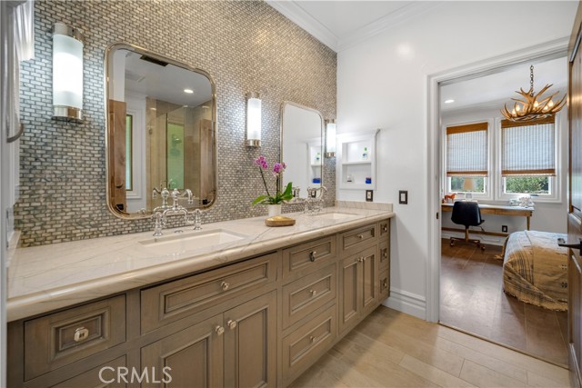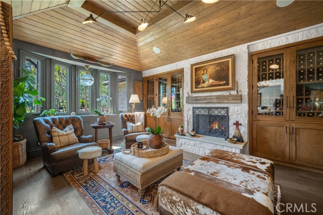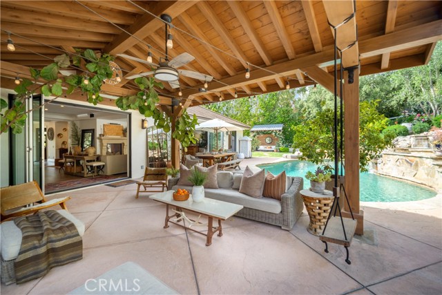 This Beautiful Country Vineyard Estate in the Heart of Hidden Hills has been lovingly remodeled by its designer/owner, Catherine Sorensen, with exquisite craftsmanship and timeless style. This extraordinary home nestled on a private road offers the utmost in luxury, privacy, and sophistication with no detail overlooked you feel like you are in a 5 star boutique hotel. Enter through a dramatic glass-and-steel pivot door into a home where every detail has been thoughtfully curated. The heart of the home is the stunning open-concept kitchen, featuring a large quartzite island, custom walnut cabinetry, built-in banquette area, Waterworks fixtures, Wolf range, Miele coffee station, and steel beam construction accents, a stunning custom hood and a 36" each Sub-Zero side by side Fridge and Freezer. Bi-fold doors open wide to the backyard, creating seamless indoor-outdoor flow—perfect for entertaining family and friends. The serene primary suite is a sanctuary, boasting reclaimed wood ceilings, a copper soaking tub, heated floors, steam shower, sauna, and Newport Brass and Walker Zanger finishes. With 5 bedrooms, 5 bathrooms, an office, and a wine room with wood-paneled ceilings and steel beams, and room for a guest house , the home exudes quality throughout. Wide-plank White Oak floors , quartzite counters, and a Sonos sound system complete the interiors. The grounds are a Mediterranean dream: drought-tolerant landscaping, lush lawns, a sparkling pool/spa, outdoor kitchen, producing vineyard (Cabernet & Syrah), orchard with citrus, fig, peach, and pomegranate, greenhouse garden, chicken coop, goat area, and horse zone with plumbing. Exterior highlights include smooth stucco, real limestone, low-voltage lighting, and enchanting pathways framed by roses, rosemary, lavender, and espaliered apple vines.Located in the coveted Hidden Hills community with 25 miles of bridle trails, equestrian amenities, tennis courts, pool, and a performing arts theater. Situated within the prestigious Las Virgenes School District and in close proximity to some of Southern California’s most elite private schools.