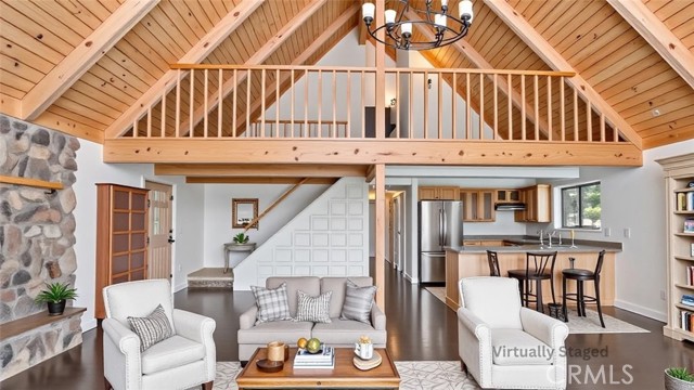 Welcome to 19383 Stonegate Road! Wonderful views and setting for this modified A Frame home... This property is really sweet & special inside with custom wood & open beam ceilings, the kitchen is updated with newer appliances & granite counter tops. The living/great room has a wood stove insert and soaring ceilings with sliding glass doors leading out to the large deck, enjoy the spectacular sunsets over the mountains and lake from here. The main level features two bedrooms, and a full bathroom. Walk upstairs to the delightful open loft area and from here to another bedroom which is spacious & bright, and here is also bathroom. Going downstairs with the option of a separate exterior entrance we have a fantastic large studio with open concept kitchen/living/bedroom, tiled floors and a neat bathroom. There is even a stacked washer and dryer here for added convenience. Sliding glass doors leads to a private concrete patio. Modest from the exterior, this home is full of delightful surprises. A must see to appreciate.